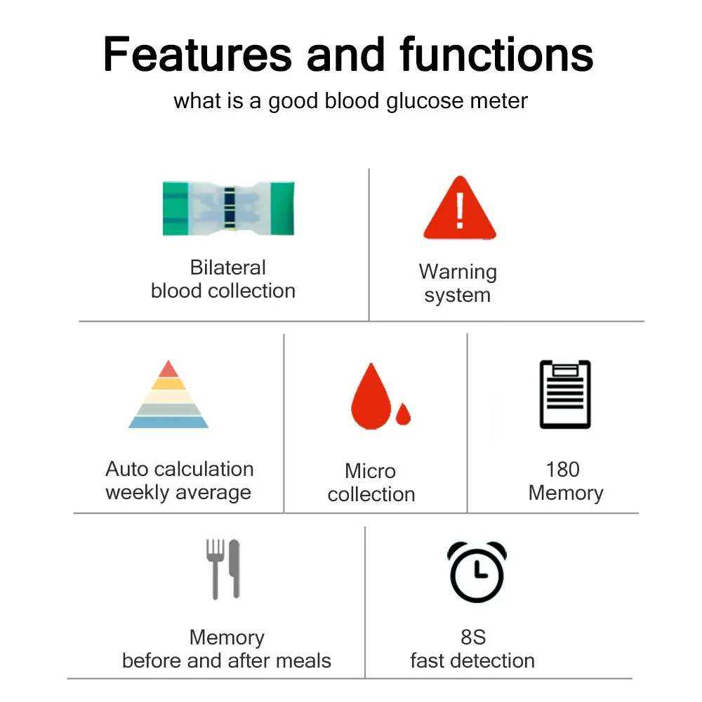 1. Точное измерение 2. Микро-сбор крови 3,180 наборов числовых записей 4. Измерьте свой уровень сахара в крови в любое время-маленькая, гладкая форма, легко хранить и готова к измерению 5. Цифровой ЖК-дисплей высокой четкости-цифровой дисплей высокой четкости, 180 наборов записей данных, отображение времени, превышение стандартного напоминания 6. Более точных результатов измерений -- более электродов, точные результаты измерений, 2-полосная индуктивности сифон с односторонним всасыванием и левые и правые руки может быть прост в эксплуатации 7. Микро глюкозы в крови-закрыть управление звуком, чтобы не вызывает болезненных ощущений для забора крови, объем крови составляет всего 0,8 мкл 8. Удобное Обнаружение-дайте тестовый чип, чтобы понять состояние глюкометра в крови в любое время и в любом месте 9. Портативная коробка для хранения-защита глюкометра в крови, организация и хранение, легко носить с собой 10. Низкое энергопотребление для длительного использования