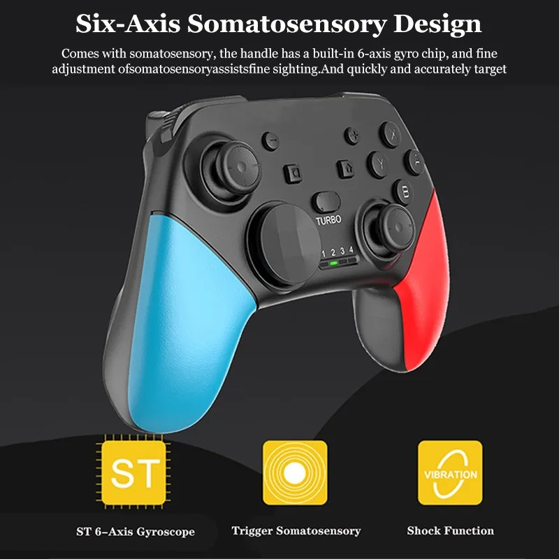 Параметры продукта: Название продукта: беспроводной Bluetooth геймпад Емкость аккумулятора: 600 мАч Максимальный рабочий ток: <200 мА Время непрерывного использования: 6-8 ч Время зарядки: около 2 часов BT4.0, Расстояние передачи: ≤ 8 м Размер ручки: 16 см * 11 см * 4,5 см Вес посылки: 250 г Особенности геймпада: (1) Этот контроллер совместим с хостом коммутатора, а также поддерживает компьютеры Windows и устройства Android. (2) Нет необходимости загружать любой драйвер, контроллер может быть использован после подключения к хосту переключателя. (3) беспроводное соединение Bluetooth, сильная способность анти-помех, стабильный сигнал подключения и свободная работа. (4) Встроенный литиевый аккумулятор. (5) эта ручка поддерживает функцию оси гироскопа и функцию двойной вибрации двигателя. (6) до 4 беспроводных контроллеров можно подключить к хосту одновременно. (7) игра может играть нормально даже при зарядке контроллера. Упаковка продукта: Геймпад * 1 Зарядный кабель * 1 Руководство * 1