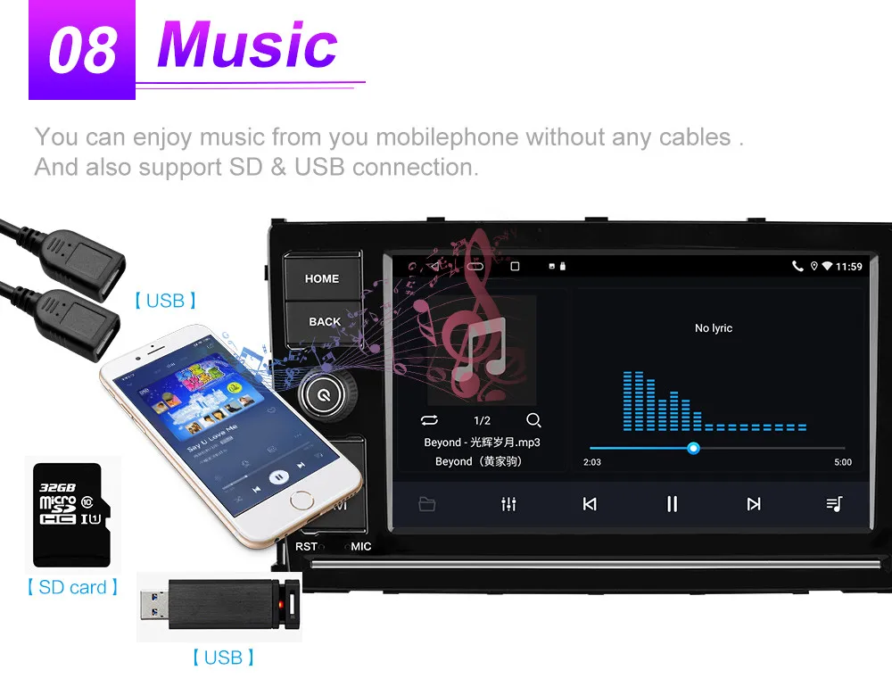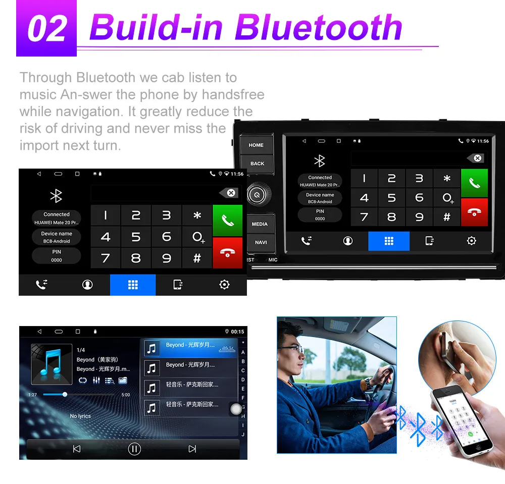 Android 10: Sound effect 37534, 7026 audio output 2.1, 1 CVBS output, reversing / AUX / DVR video input, Bluetooth 2.1, front USB front IR, picture-in-picture support, left and right split screen