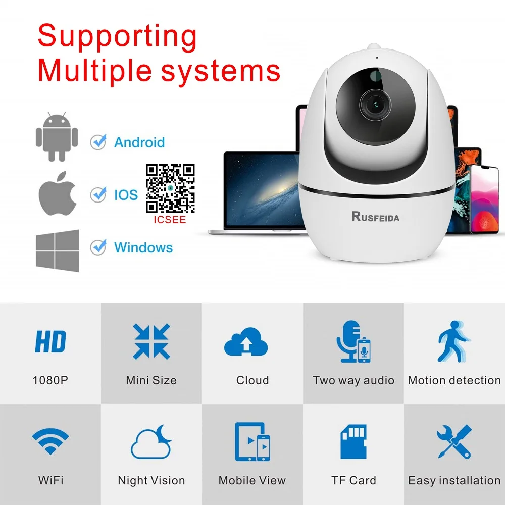 1. Потрясающее видео 1080P Full HD. 2. Диапазон ночного видения до 32 футов. 3. Обнаружение движения и push-уведомление отправляются в приложение ICSee. 4. Двухканальное аудио в режиме реального времени со встроенным микрофоном и динамиком. 5. Удаленный просмотр в приложении ICSee для iOS и Android. 6. Встроенный слот карты Micro SD, способный хранить до 128 ГБ кадры.