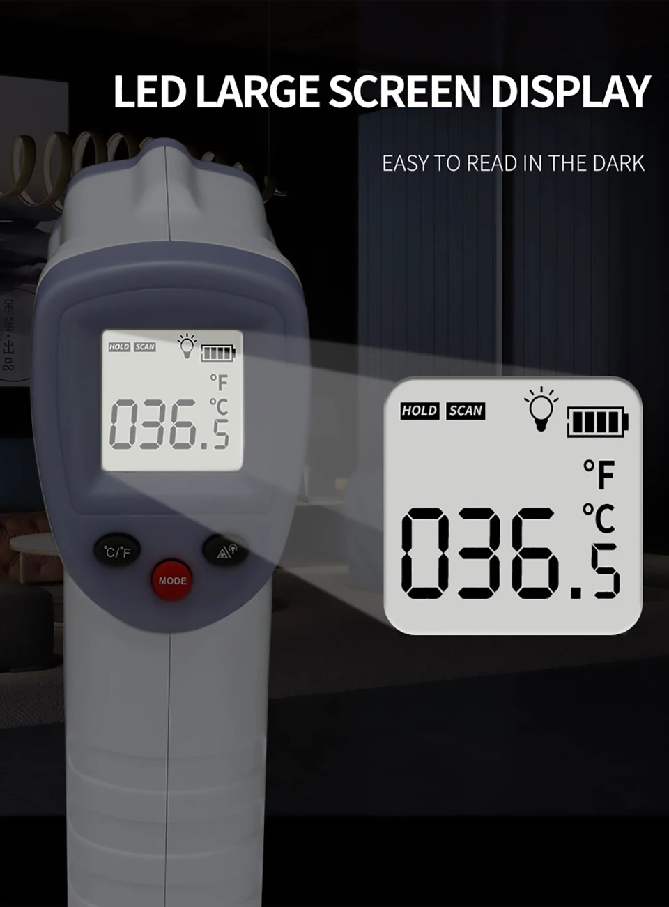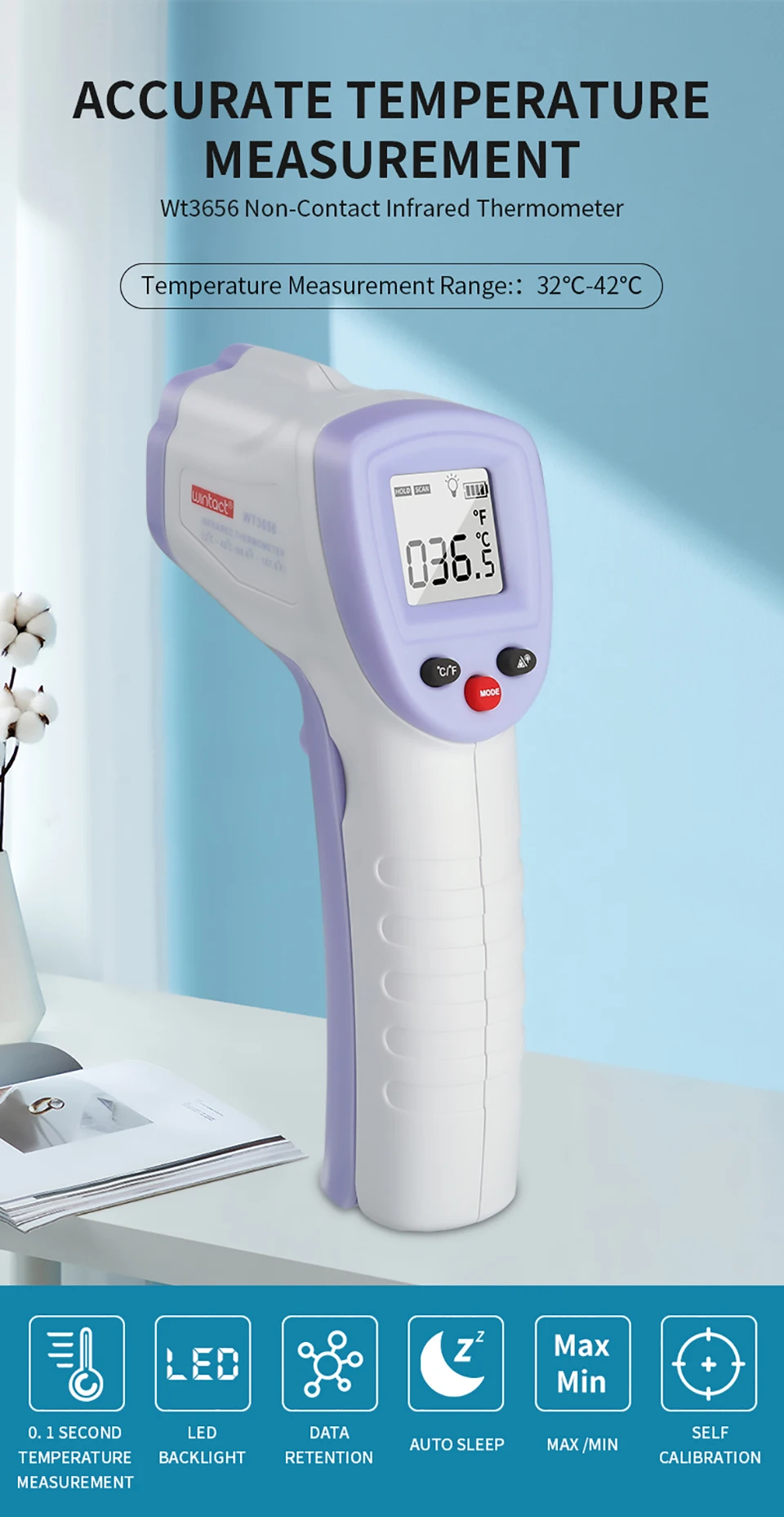 1. Точные измерения: продукт принимает оптический принцип, точность измерения контролируется при ± 0,2 ℃. 2. Простое управление: продукт поддерживает измерение температуры одной кнопкой. 3. Удобное чтение: продукт принимает режим чтения цифрового дисплея и поддерживает дизайн подсветки. 4. Высокая безопасность: продукт поддерживает бесконтактные измерения, что значительно повышает безопасность. 5. Настройки коррекции: Функция F1 - Unit seting-F1 (заводской по умолчанию градус Цельсия) Настройка звукового переключателя F2- Hint (заводская настройка звукового сигнала по умолчанию) F3. Предупреждение о высокой температуре setting-F3 (фабрика ℃ 37,5) F4-Настройка подсветки (заводская установка по умолчанию) F5- Exit Setup Mod, когда в состоянии F1/F2/F3/F4 нажмите кнопку настройки (setup) в течение 3 секунд, чтобы автоматически выйти из настройки. Описание: 1. Хранение данных: хранение 32 наборов данных измерений, что удобно для индивидуального и многоличностного анализа и сравнения. 2. Преобразование единиц измерения: Цельсия и Фаренгейт могут быть преобразованы между различными странами и регионами. Характеристики: Цвет: фиолетовый Материал: АБС-пластик Рабочая температура: температура окружающей среды 10,0 ℃-35,0 ℃ (50,0 ℉-95,0 ℃) Напряжение источника питания: 3,0v2 * AAA щелочная батарея (не входит в комплект) Размер изделия: Д * Ш * В: 149*90*45 мм Диапазон измерения: 35 ℃-42,9 ℃ (95,0 ℉-109,2 ℉) (режим температуры тела) Точность: 35 ℃ -42 ℃ (95,0 ℉-107,6 ℃) : ± 0,2 ℃ (± 32,4 ℃) Снаружи 35 ℃ -42 ℃ (95,0 ℉-107,6 ℉): ± 0,3 ℃ (± 32,5 ℃) Расстояние измерения: 1 см ~ 3 см Транспортировка хранения: -20 ℃ ~ + 55 ℃ (-68,0 ℉ ~ + 131,0 ℉), относительная влажность: ≤ 93% Срок службы: 2 года Посылка включает в себя: Бесконтактный инфракрасный термометр для лба-1 шт. Руководство по эксплуатации-1 шт. 1 x Сертификация компетентности Примечания: 1. Из-за разницы между различными мониторами изображение может не отражать фактический цвет изделия. Мы гарантируем, что модель реального изделия не отличается от представленной на фото. 2. Возможны незначительные отклонения в размерах из-за различных измерений вручную.
