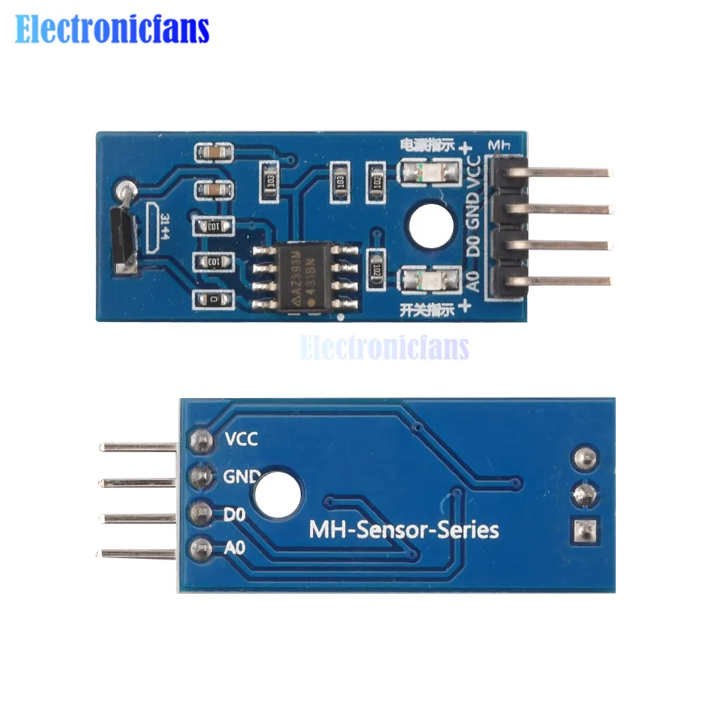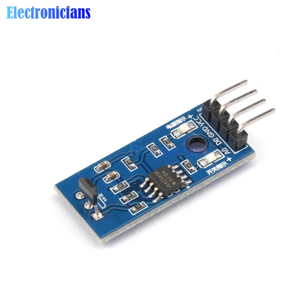 3144E Датчик Холла s модуль 4pin переключатель Холла скорость магнитных Swiches счетчик скорости модуль датчика для Arduino Smart CarОсобенности продукта: 1) Рабочее напряжение: 3,3-5V2, используя 3144E Тип переключателя датчик Holzer.3. Когда датчик находится в магнитном поле, цифровой выход низкий, сигнальный светильник яркий; Если нет индукции к магнитному полю, то цифровой выход высокого уровня, сигнальный светильник не яркий.4 с индикатором питания и сигнальным индикатором.5 Выходной режим: цифровой коммутационный выход (0 и 1) порт AO не действителен6 LM393 компаратор выход, модель чистая, хорошая форма волны, сильная способность вождения, более 15 мА.Предусмотрено 7 фиксированных отверстий для болтов, что удобно для крепления и фиксации.8 используется для скорости двигателя, определения положения и т. д. Введение функции датчика: 3144 интегральная схема холла, основанная на принципе эффекта Холла, использование полупроводниковой интегрированной технологии магнитного зондирования, это устройство регулировки напряжения, генератор напряжения холла, дифференциальный усилитель, триггер Шмитта, схема компенсации температуры, и этап выхода открытого коллектора состоит из цепи обнаружения магнитного зондирования. Вход для магнитной индукционной интенсивности, выход-это цифровой сигнал напряжения. Датчик имеет следующие характеристики: малый размер, высокая чувствительность, быстрая реакция, Хорошая температурная производительность, высокая точность, высокая надежность. Описание подключения: 1, VCC-силовой катод2, ГНД-силовой катод3, цифровой выход DO - TTL4, АО-аналоговый выход (различное расстояние до выхода разного напряжения) Посылка включает в себя: 1x модуль датчика Холла