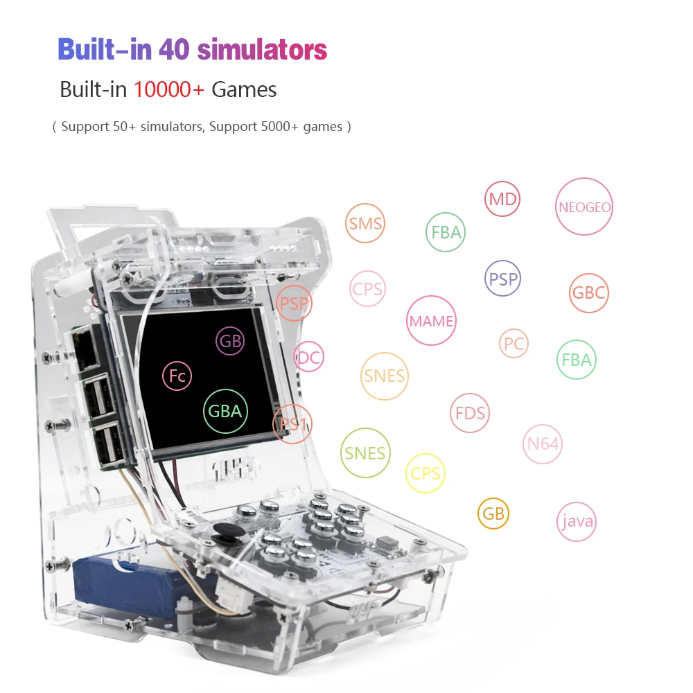 Предварительно установите систему Retropie с 40 видами симуляторов. Поддержка MAME,NES,SNES,GBA,GBC,PS1,CPS более 50 видов симуляторов и 50000 игр