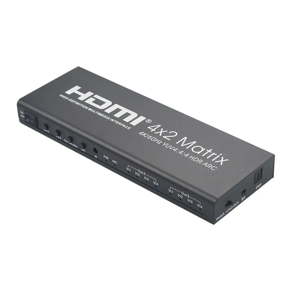 Входной четырехполосный источник сигнала HD можно переключить на двухполосный выход HDMI, а два выходных интерфейса можно переключить для отображения разных изображений или одного и того же изображения. Он поддерживает канал чистого аудиовыхода HDMI, а также выход для оптоволокна и стереонаушников (аудиовыход можно переключать между a или out B). Он может легко переключать или распределять четыре HD сигнала на двух HD совместимых дисплеях или проекторах. Наше оборудование обеспечивает контроль уровня шума, пространства и безопасности, центр обработки данных, и широко используется в сфере распределения информации, конференц-зала, выставочного зала, школы и окружающей среды для обучения предприятий.