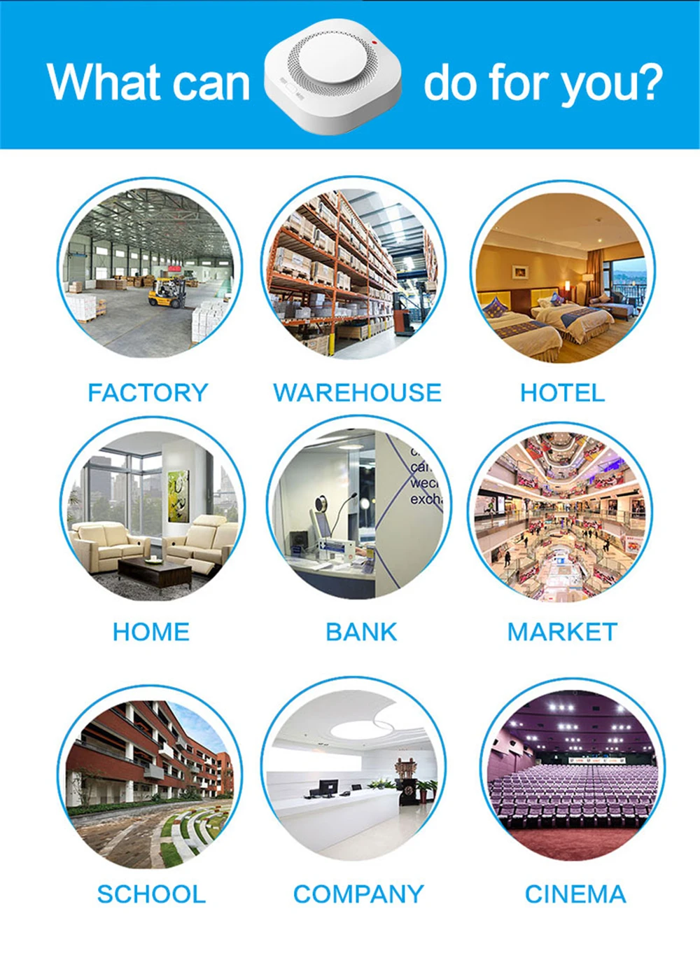 Введение продукции: сигнализация детектора дыма («alarm» короче)-это бытовая фотоэлектрическая пожарная сигнализация для обнаружения дыма, с возможностью обнаружения дыма от Тонкого начала пожарного события, звуковой сигнал и светильник в режиме реального времени. Технические параметры: Питание: DC9V литиевая батарея (6F22/9В) Статический ток:<10uA Ток тревоги: <100mA Выбросов расстояние: ≥ 100 м (открытое пространство) Рабочая температура: 0 ℃ ~ + 50 ℃ Относительная влажность: ≦ 95% RH, без конденсации звуковой сигнал:>80 дБ Отключение звука и тестирование: Отключение звука: в состоянии дымовой сигнализации, нажмите кнопку «Test», чтобы отключить будильник, и светодиодный светильник будет мигать отдельно. Тестирование: в нормальном состоянии нажмите кнопку 'test', чтобы запустить винт сигнализации Способ установки: a. Просверлите отверстия на потолке с помощью сверла; b. Вставьте пластиковые расширительные гайки в отверстия; c. Закрепите монтажную пластину с помощью самоблокирующихся винтов; d. Выровняйте заднюю часть детектора близко к рту монтажной пластины, поверните по часовой стрелке, И установка выполняется, если вы услышали звук 'kata'snap.