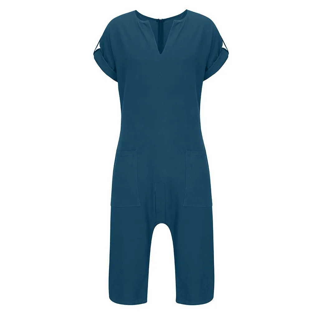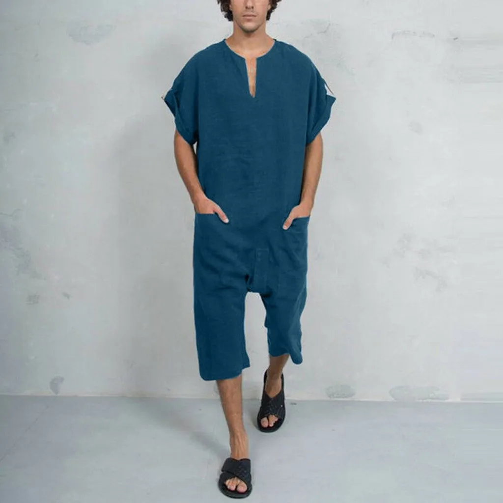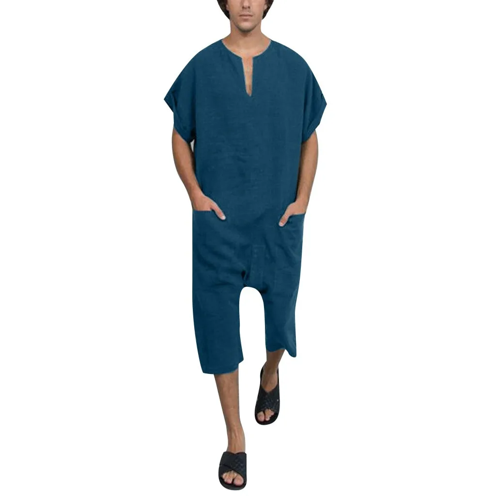 Мужской винтажный летний Повседневный однотонный хлопковый льняной топ с короткими рукавами и штаны комбинезоны