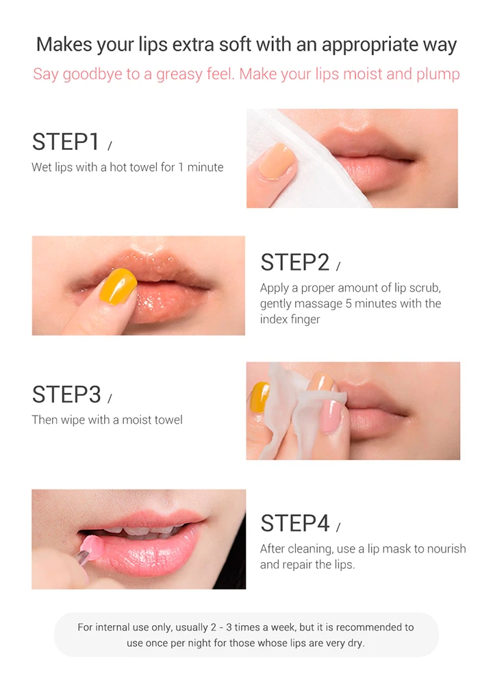 Делает спа-салон для губ ночью, чтобы глубоко питать ваши губы, и помогает создать более полные губы Делает ваши губы более мягкими с подходящим способом Попрощайтесь с жирным ощущением. Сделайте губы влажными и пухлыми STEP1/ Влажные губы с горячим полотенцем в течение 1 минуты STEP2/ Нанесите правильное количество скраба для губ, мягко массируйте 5 минут указательным пальцем STEP3/ Затем протрите влажным полотенцем STEP4/ После очистки используйте маску для губ, чтобы питать и восстанавливать губы. Только для внутреннего использования, обычно 2 - 3 раза в неделю, но рекомендуется использовать один раз в ночь для тех, чьи губы очень сухие.
