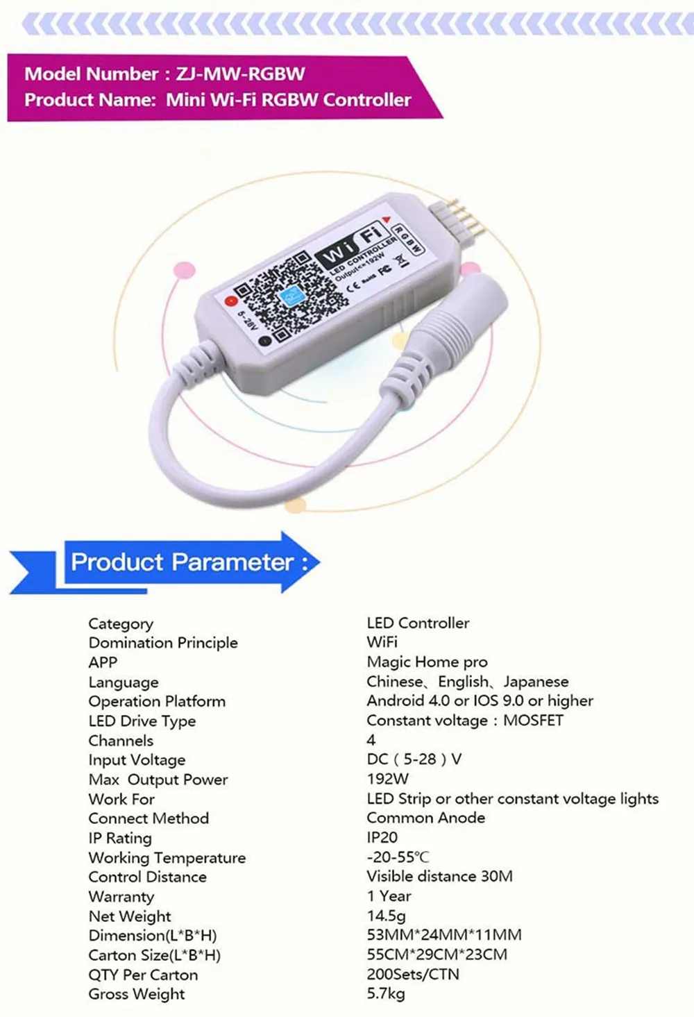 * Управляя светодиодный светильник с вашим смартфоном, этот WIFI контроллер обеспечивает большую гибкость.