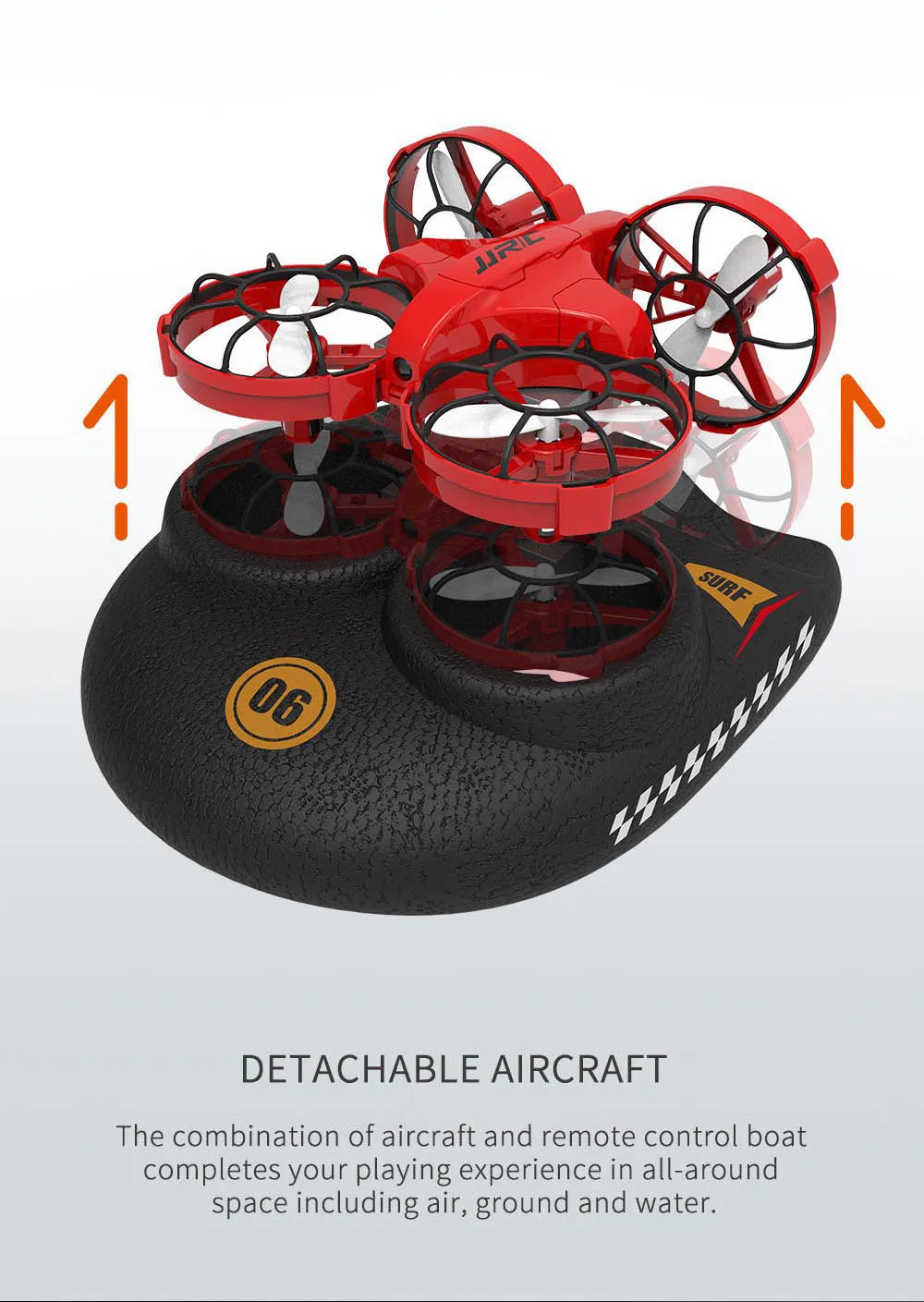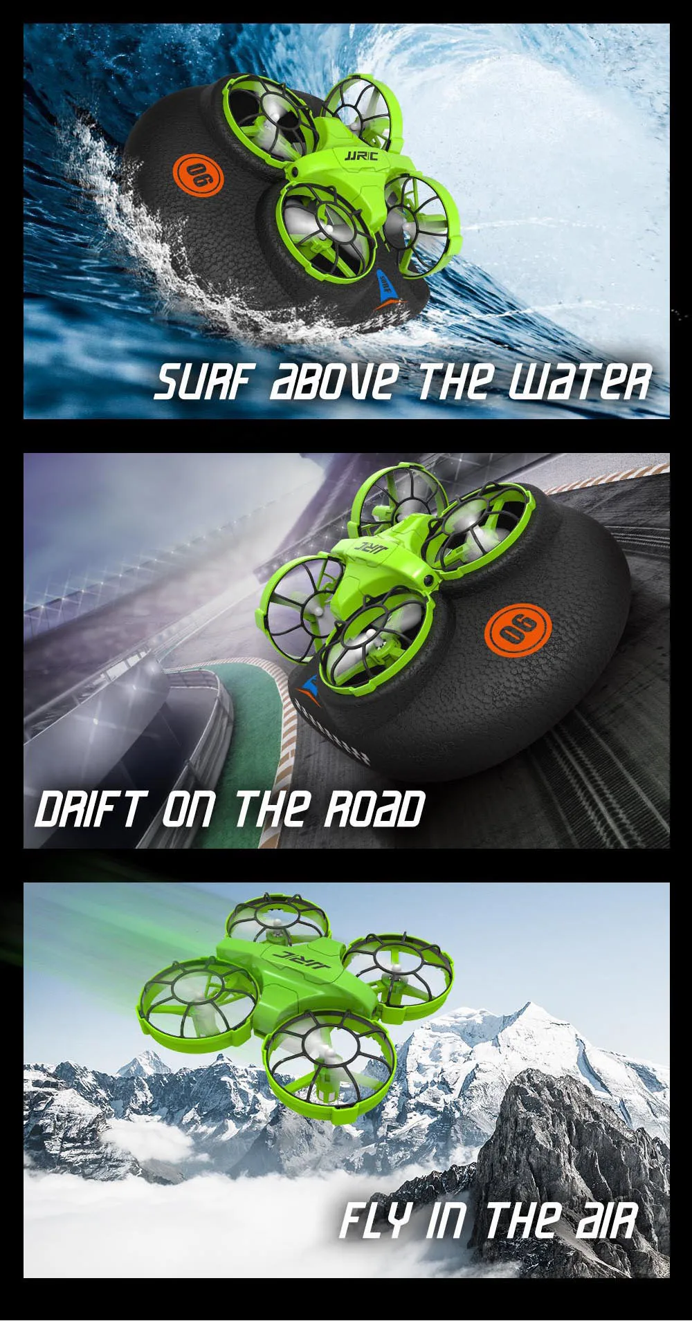 Водный, наземный и воздушный режим 3 в 1 Три режима: ①Режим полета (Используйте самолёт) ② Наземный режим (сочетание самолета и воздушной подушки) ③ Режим водной поверхности (сочетание самолета и воздушной подушки)