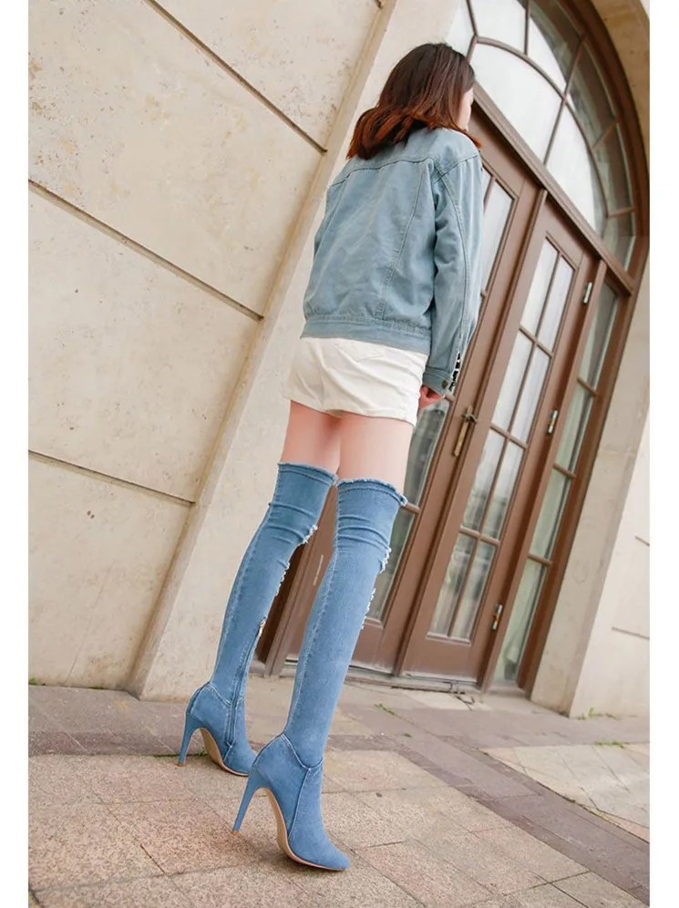 Большие размеры 36-42; Женские эластичные джинсовые сапоги; Высокие сапоги до бедра; Сапоги выше колена; Ковбойские высокие женские сапоги на высоком каблуке; botas mujer