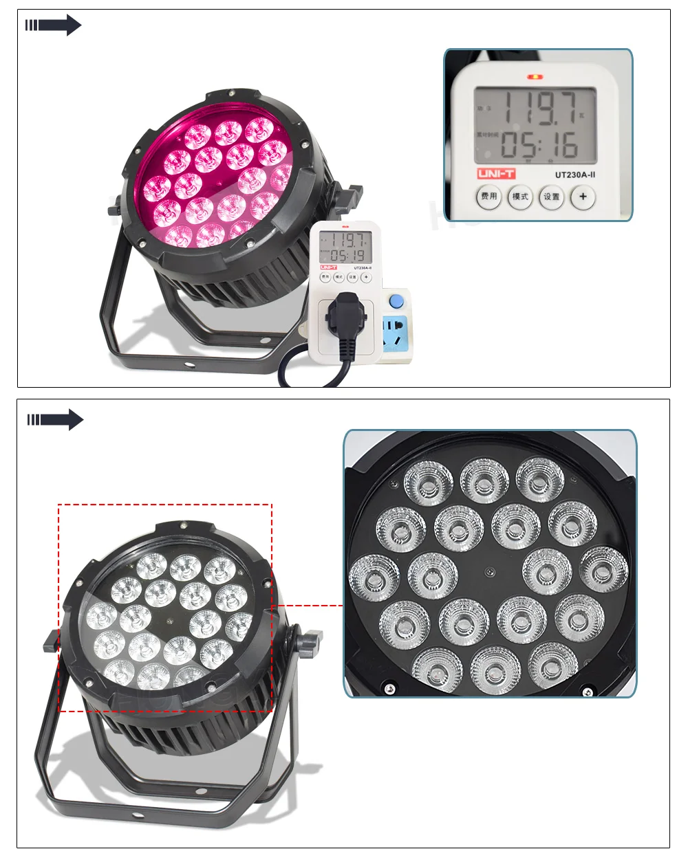 • 5 режимов работы: статический цветной режим, режим RGBAW и УФ-диммер, программный режим, режим цветного макроса и DMX-контроль