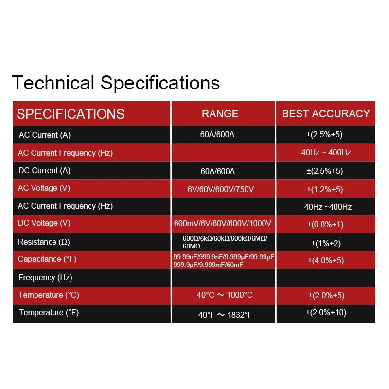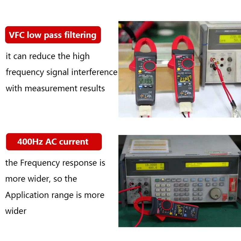 1. True RMS 2. Автоматический диапазон, 3 раза/с частота дискретизации 3. Макс/мин/относительные режимы 4. Датчик температуры k-типа 5. Фонарик 6. Измерение 400 Гц 7. NCV, Бесконтактное тестирование напряжения переменного тока 8. VFC, фильтр низких частот 9. Функция обнуления 10. Сила тока 11. Аналоговый барный график
