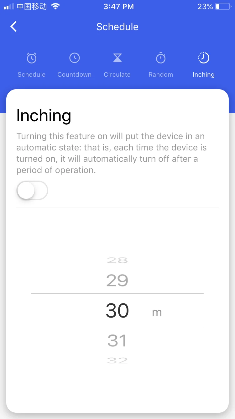 Установите время работы в приложении, затем ваше устройство может автоматически выключиться, когда время истекло Например, если вы установите 30 минут инчинга, то по истечении 30 минут устройство автоматически выключится