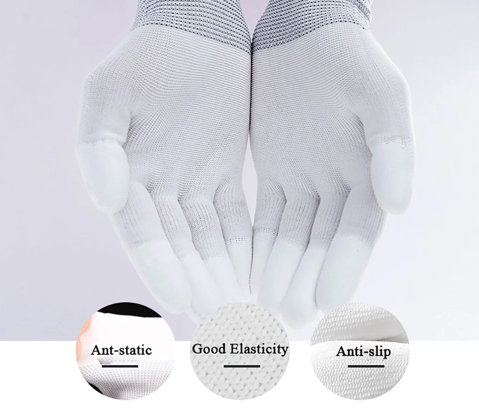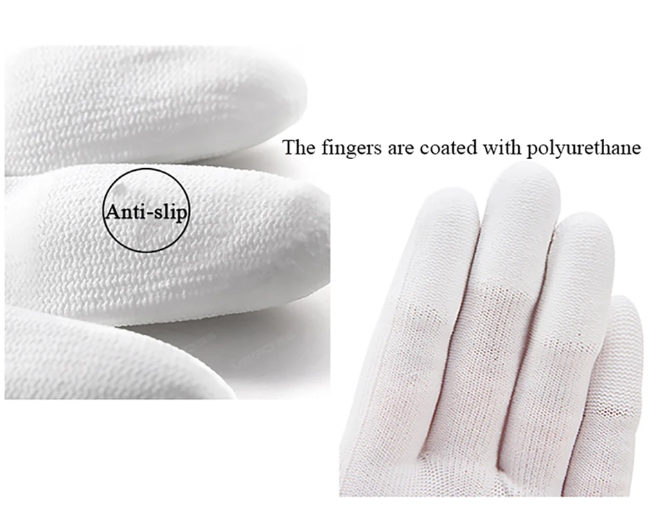 VSGO антистатические чистящие перчатки (белые) DDG-1 1. Эти перчатки обладают отличной эластичностью, противоскользящими и антистатическими свойствами 2. Части пальцев покрыты полиуретановым покрытием 3. Перчатки имеют хорошую воздухопроницаемость и очень подходят для очистки камер, компьютеров и т. д.