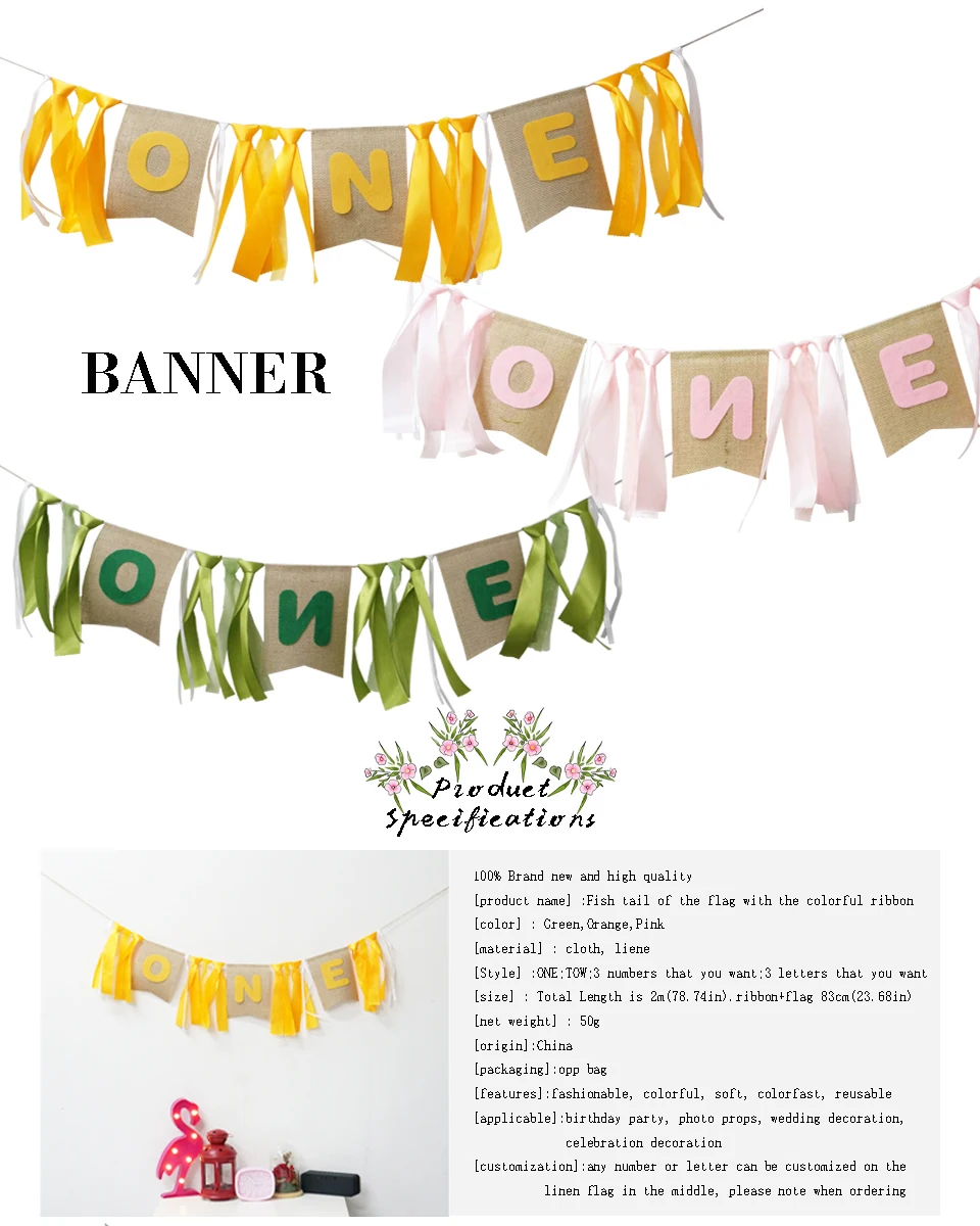 Colorful Ribbon Banner Baby Shower First Birthday Party ONE/TWO Flag Chair Nursery Garland Candy Bar Decoration Description: 100% Brand new and high quality [product name] :Fish tail of the flag with the colorful ribbon [color] : Green,Orange,Pink [material] : cloth, liene [Style] :ONE;TOW;3 numbers that you want;3 letters that you want [size] : Total Length is 2m(78.74in).ribbon+flag 83cm(23.68in) [net weight] : 50g [origin]: China [packaging] : opp bag [features] : fashionable, colorful, soft, colorfast, reusable [applicable] : birthday party, photo props, wedding decoration, celebration decoration [customization] : any number or letter can be customized on the linen flag in the middle, please note when ordering TIPS: Due to the light and screen difference,the item's color may be slightly different from the pictures. Please allowed some differences due to manual measurement. Thanks for your understanding.