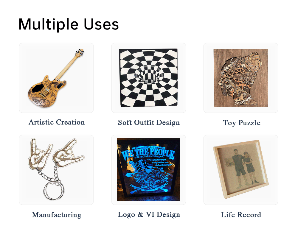 Широкая совместимость:Машина совместима с различными зрелыми программным обеспечением гравировки, такими как LaserGRBL, LightBurn, Benbox, GrblController, LiteFire, поддержка s PWM режим гравировки, поддержка s система Windows, система Apple (LightBurn), И формат гравировки файлов поддерживает JPG, PNG, DXF, SVG, g-код, NC, BMP и т. Д.