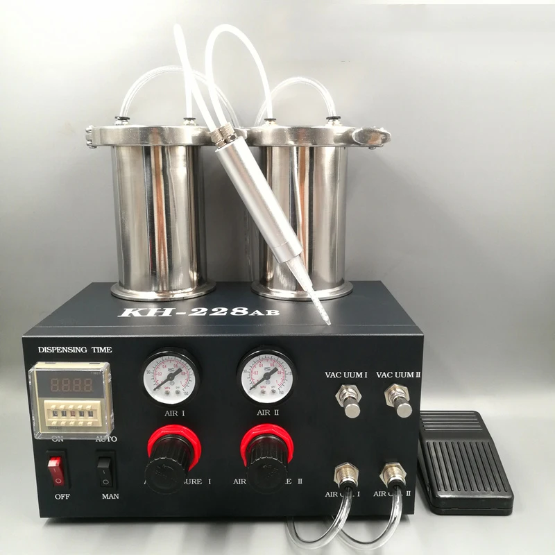 Модель: KH-228AB Характеристики: 1. Размеры: 240 мм × 160 мм × 140 мм 2. Вес: 4 кг 3. Источник питания: ac220в ± 10%/50 Гц 4. Потребляемая мощность: ≤ 8 Вт 5. Общее давление воздуха: 0.8Mpa (макс.) 6. Диапазон регулировки давления клея: 0-0.8Mpa 7. Диапазон регулировки времени клея: 0-99,99 S (можно установить увеличение) 8. Режим работы: ручной/полуавтоматический (количественный разряд) 9. Функция обратного всасывания: регулируется до минус 600 мм рт. Ст. (макс.) 10. Повторяемость: ± 0.05% 11. Максимальная рабочая частота: 600 раз/мин 12. Размер Минимальный расход: 0,01 мл 13. Режим управления: ножной переключатель 14. Диапазон пропорций: 1:1 - 1:2, подходит для AB клея, эпоксидной смолы и т. Д.