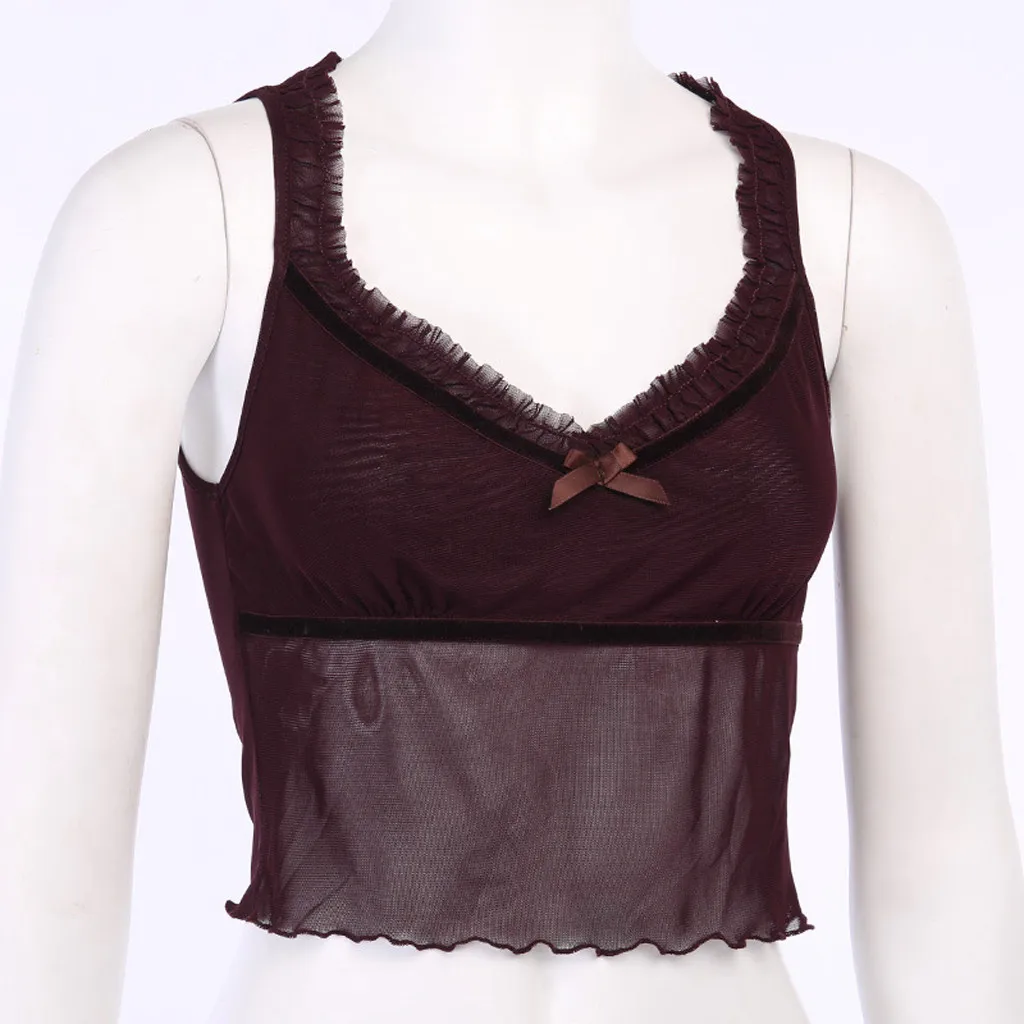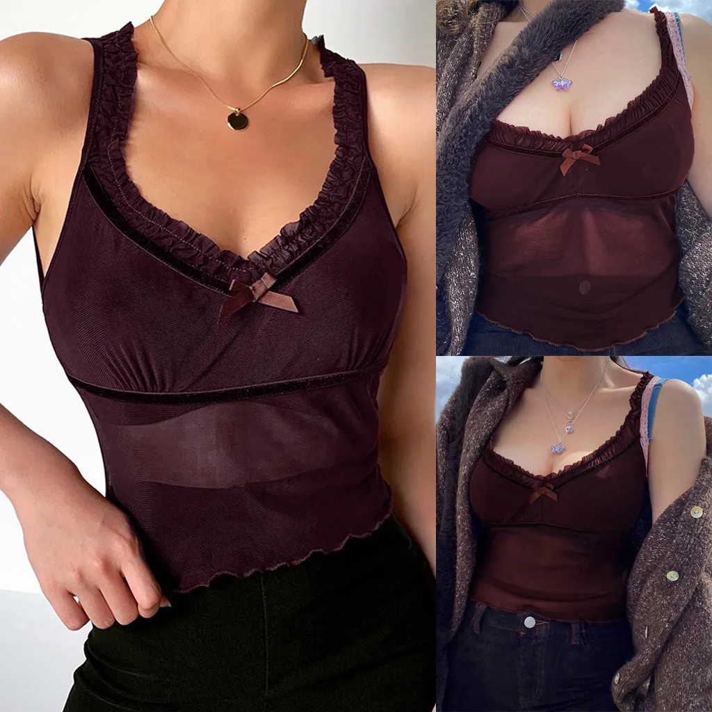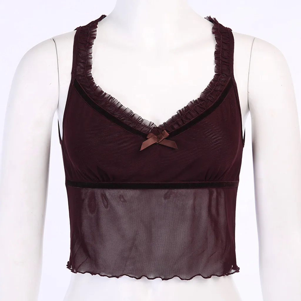 Женский модный короткий топ без рукавов, однотонный сетчатый топ с v-образным вырезом и бантом