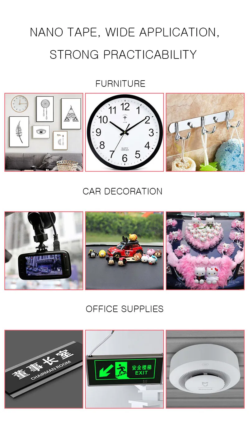 Отдел продаж: 1 рулонДлина: 3 м/2 м/1 м опциональноТолщина: 1 ммШирина: 2 смКатегория ленты: нано-лентаЦвет: прозрачныйОсобенности: двустороннийФункция: водонепроницаемый и влагостойкий, многоразовый, широко используемый.Основной материал: нано ПУ гельХарактеристика:1. Стирать, можно использовать повторно более 600 раз.2. Гель Супер сильный и моющийся и многоразовый гель формула Есть бесконечное количество потенциального использования.3. Легко снимается и не повредит ваши стены или поверхности.4. Двухсторонний клей, моющийся и многоразовый.5. Храните предметы на месте без скольжения.