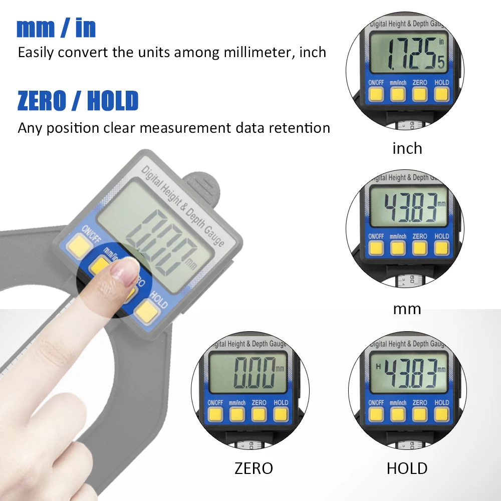 It has the following functions: any position clear, inches and millimeters conversion, measurement data retention, manual and automatic shutdown.