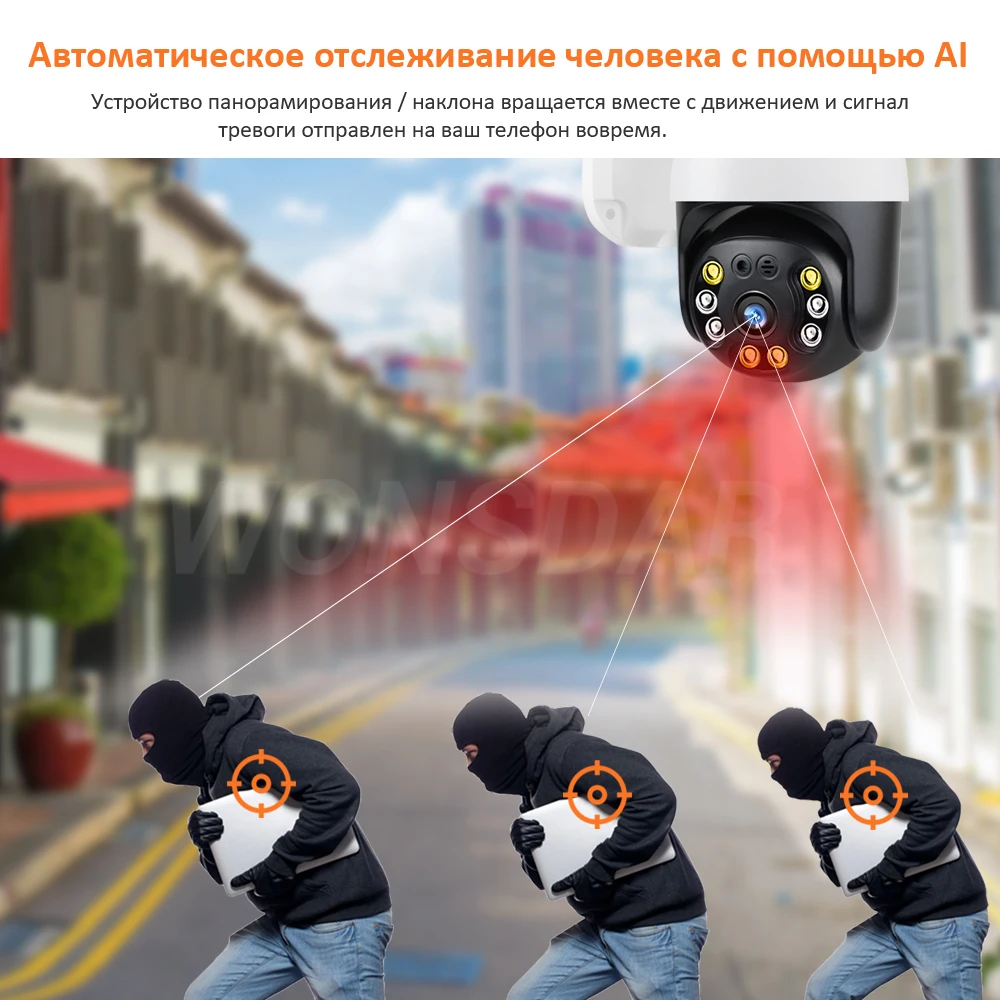 Устройство панорамирования / наклона вращается вместе с движением и сигнал тревоги отправлен на ваш телефон вовремя.