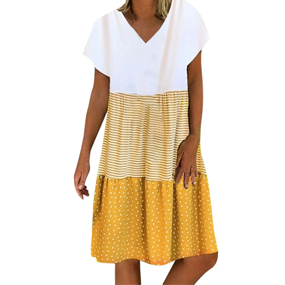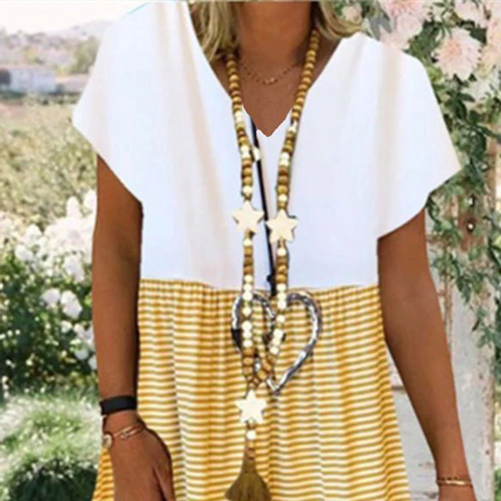 Женское свободное платье до колена в полоску с коротким рукавом и v-образным вырезом в стиле бохо