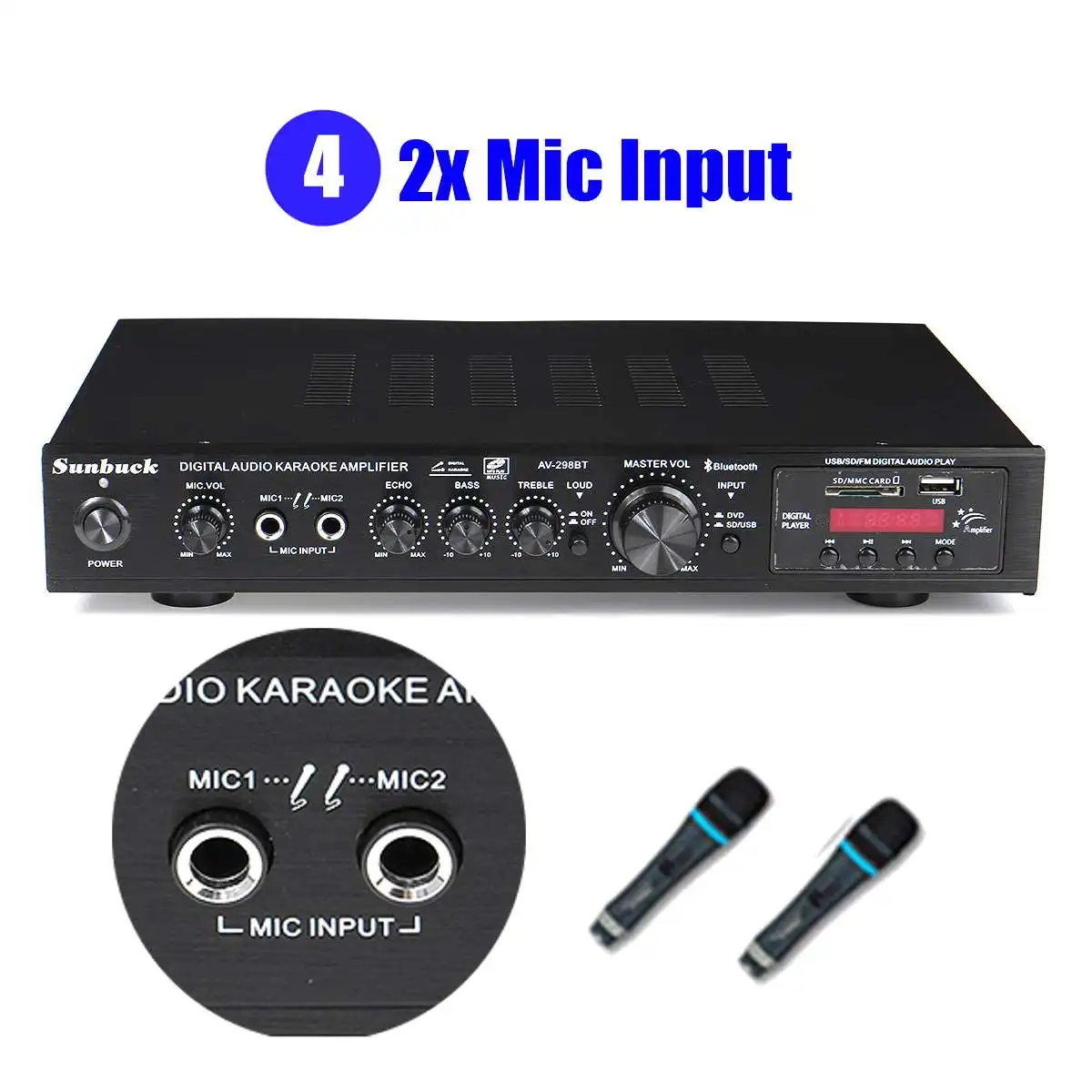 -Двойной микрофонный вход, с 2 микрофонными входами, с регулировкой реверберации микрофона.