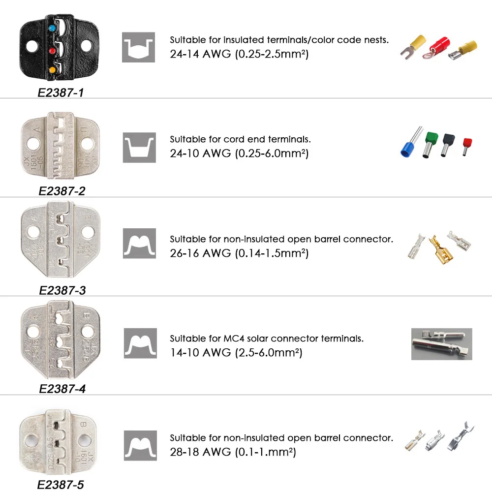 5 взаимозаменяемых клемм с различными диапазонами обжима для ваших опций.