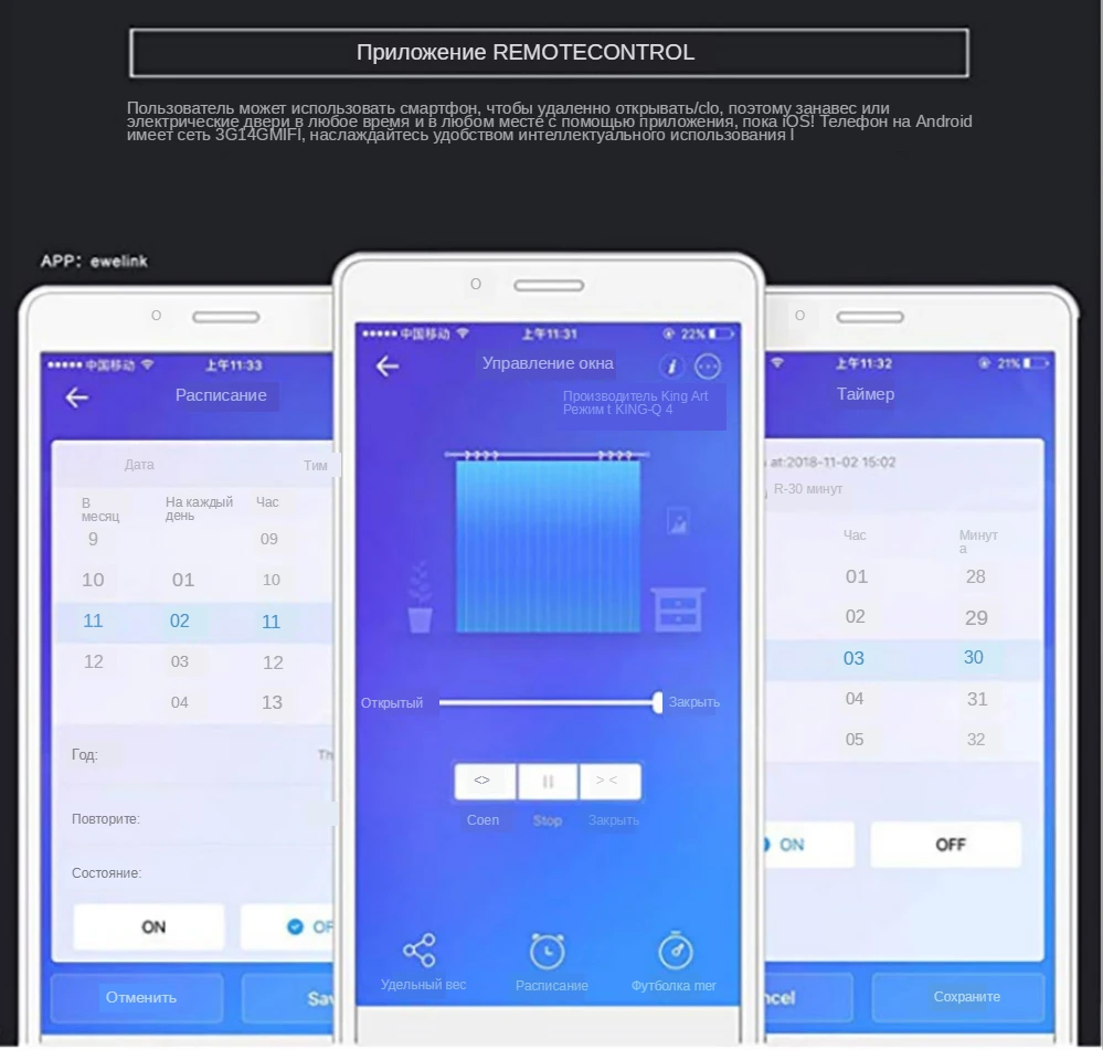 User can use a smartphone to remotely open/closo curtain or electrical door at anytime and anywhere via APP as long as the iOS!Android phone has 3G14GMIFl network, enjoy the convenience of intelligent life