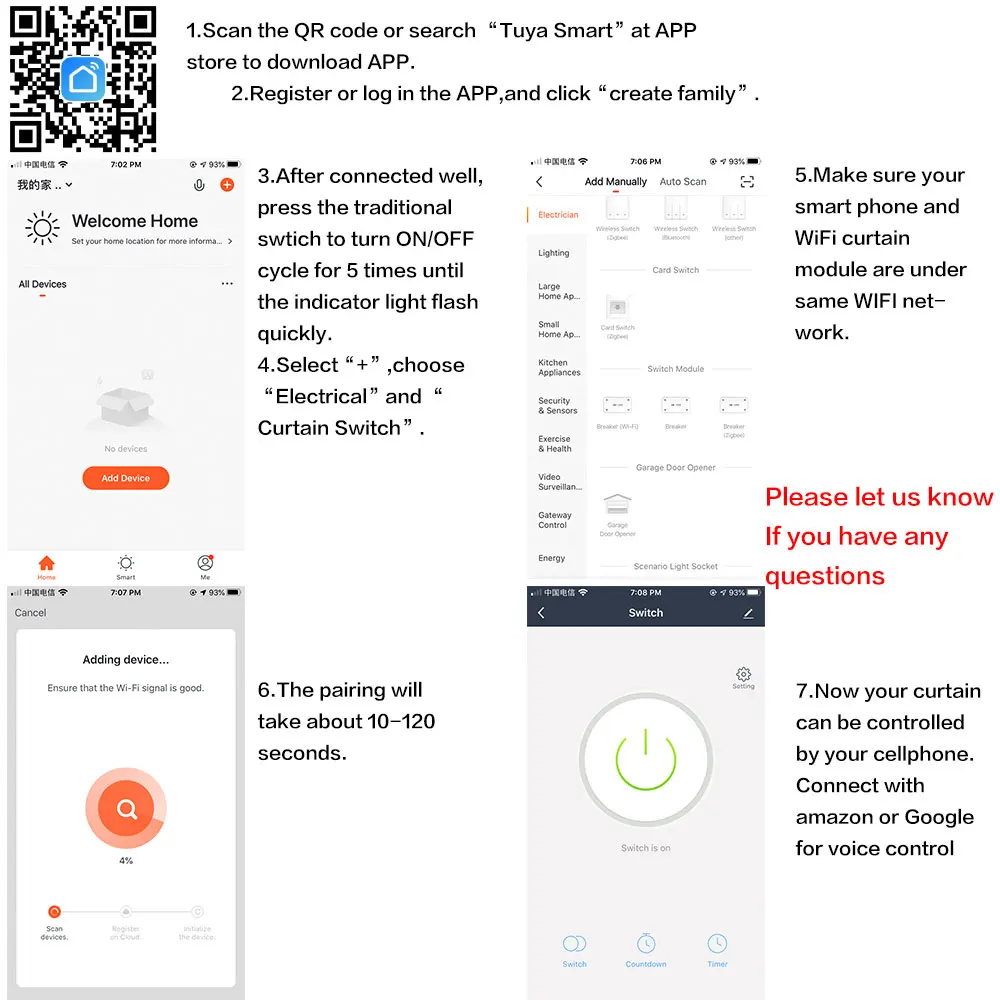 1.Scan the QR code or search "Tuya Smart" at APP store to down load APP. 2.Register or log in the APP,and chick "create family ". 3.After connected well ,press the tradition switch to turn ON/OFF cycle for 5 times until the indicator light flash quicjly. 4.Select"+",choose "Electrical" and"Curtain Switch" 5.Make sure your smart phone and WIFI curtain module are under same WIFI net-work.