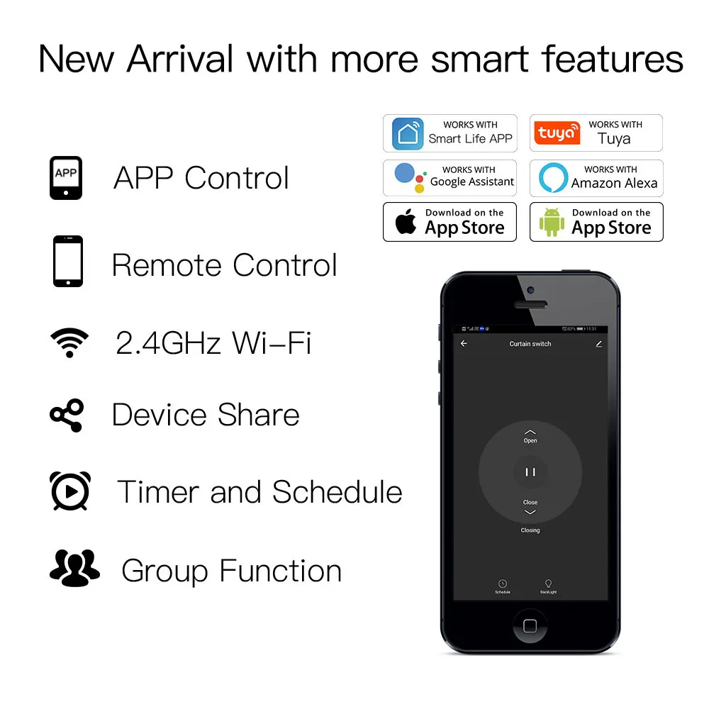 ●Voice control: once you have this switch, you can connect it with Amazon Alexa or Google Home for voice control. ●APP remote control: user can use a smartphone to remotely open/close curtain or electrical door at anytime and anywhere via ●APP as long as the smartphone has 3G/4G/WiFi network, enjoy the convenience of intelligent life. ●Shared device: this intelligent switch can have multiple control sites shared by different family members. One phone can also control multiple switches. ●Set timer: you can set a schedule to open or close your curtain.