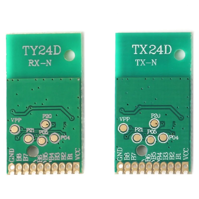 TY24D-TX-это передающий модуль, TY24D-RX-приемный модуль. Передающий модуль должен обеспечивать только 3,3 в источник питания и кнопку передачи и один светодиодный индикатор состояния передачи. Выходной порт, соответствующий приемному модулю, может выводить сигнал уровня, и модуль имеет выходной статус. Выберите режим фиксации или без фиксации.