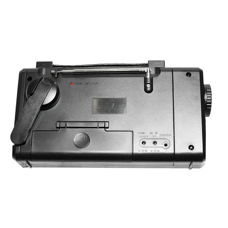 Он поставляется с AM/FM/SW/погодным диапазоном радио, термометром, зарядным гнездом для сотового телефона, dc в адаптер зарядного устройства USB, яркий светодиодный светильник для вспышки и светодиодный светильник для чтения.