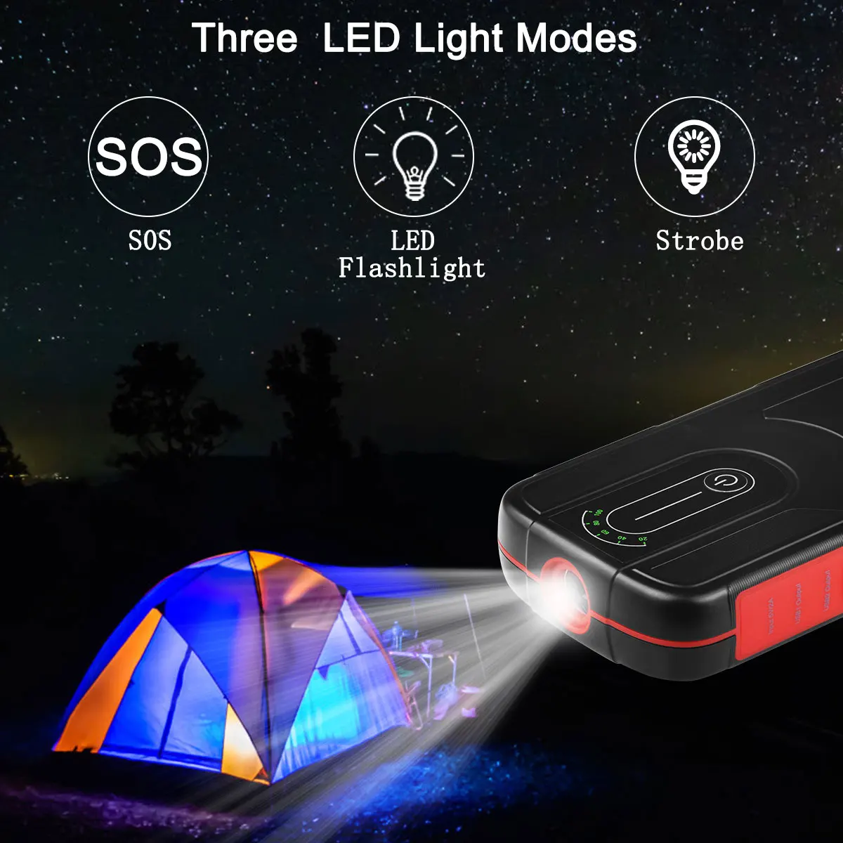 Наш стартер оснащен светодиодный фонариком, он имеет яркий, стробоскопический и SOS режимы, которые могут помочь вам в любом чехол, особенно для приключений, на открытом воздухе, ежедневно, в чрезвычайных ситуациях, в путешествиях.