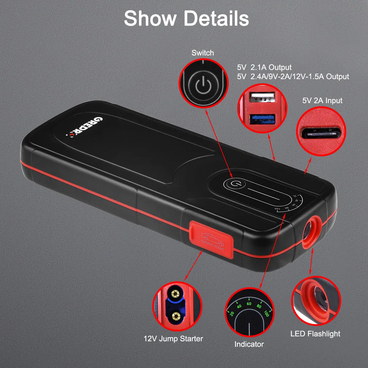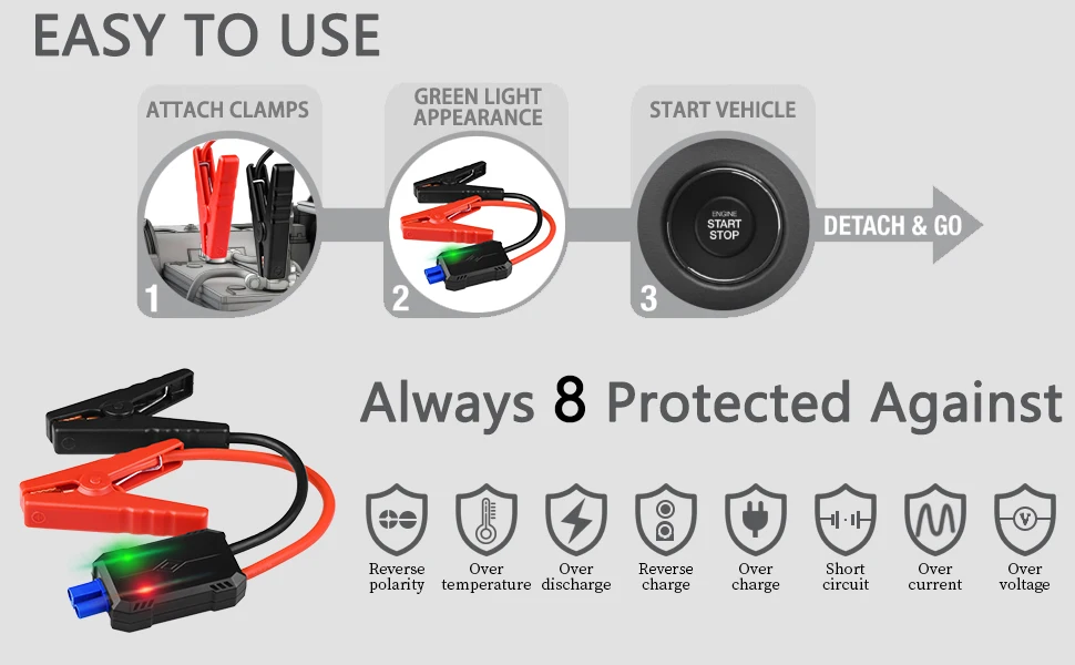Стартер автомобиля достаточно мощности, чтобы начать 12V автомобили, грузовики, мотоциклы, водные средства, ATV, UTV, косилки, лодки, RV или трактора и яхты (до 10 л газа, 7L дизельный двигатель) за считанные секунды, даже при экстремальной температуре-4 ℉ ~ 140 ℉.