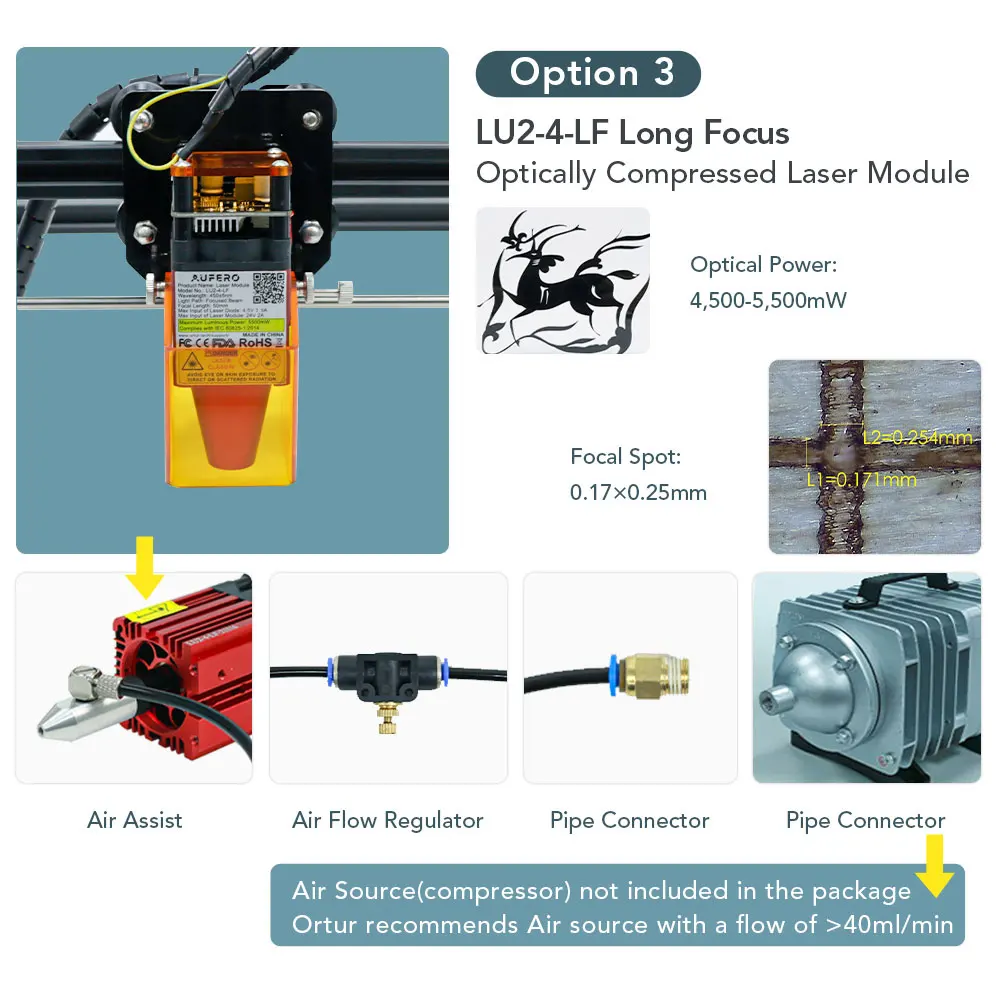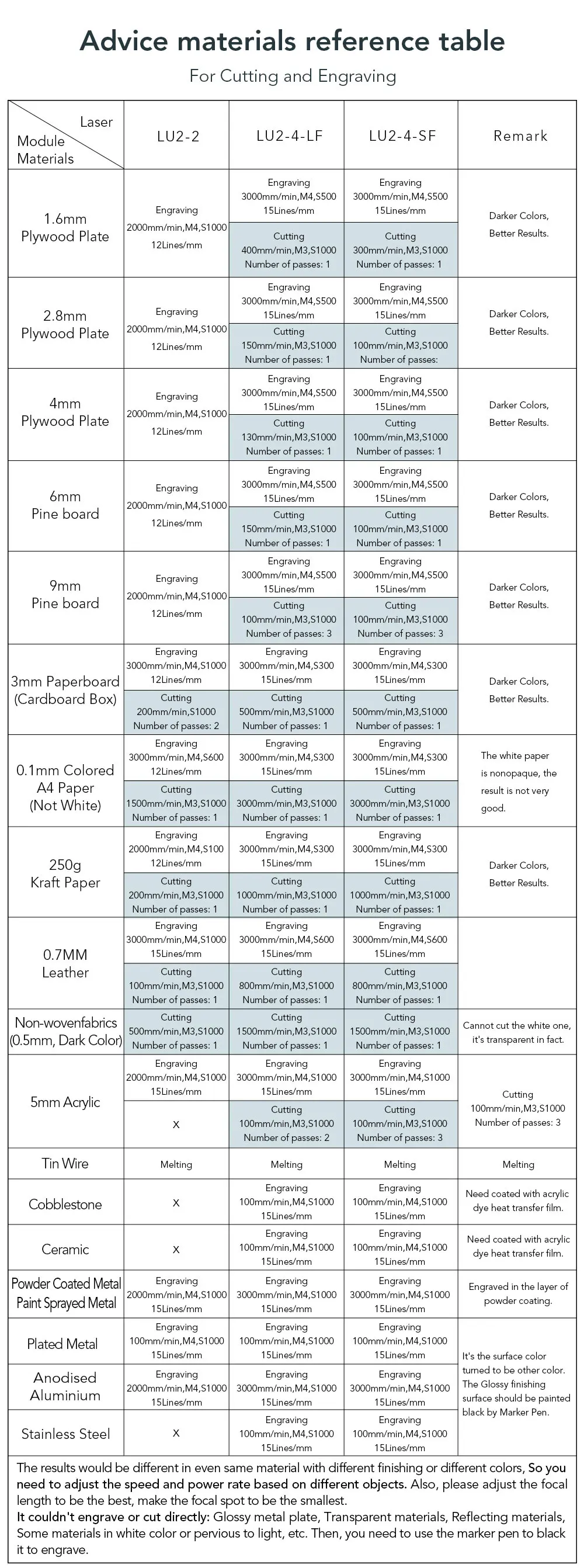 🥇LU2-4-SF оптически спрессованный лазерный модуль = LU2-4-SF лазерный модуль Ortur Laser Master 2 S2-SF гравер может достичь определенного эффекта как в резке, так и в резке. Он оснащен новейшей колледж лазерных технологий для сжатого лазерная точка, костры, 0,12*0,15 мм. Оптическая мощность достигает 4500-5500 МВт, поэтому она хорошо режет и лучше гравирует более твердые материалы. Он также может очистить 6 мм толстой древесины в rund pass. Площадь Гравировки 390*410 мм.
