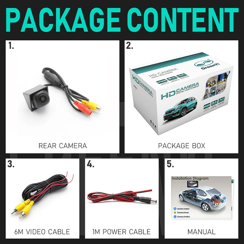 1. Камера заднего вида 2. Коробка для посылка 3. Видео кабель 6 м 4. Кабель питания 5. Руководство пользователя