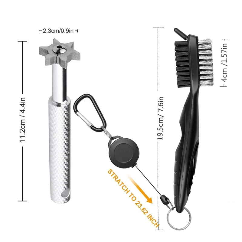 Прочный аксессуар для сумки для гольфа-щетка изготовлена из чрезвычайно прочной Пластиковой ручки, нейлоновой щетиной и алюминиевым карабином. Инструмент для Точилки паза изготовлен из высококлассной прецизионной вакуумной термообработанной стали, прочный и эффективный.