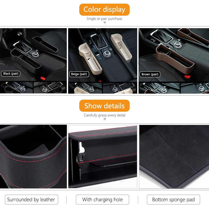 Desriotion: Материал: АБС-пластик + кожа Цвет: черный, коричневый, бежевый, красный Преимущества товара: 1. Универсальный дизайн, подходит для большинства автомобилей, без сложного монтажа. 2. Увеличьте пространство для хранения в автомобиле, чтобы хранить счета, планшеты, книги, мобильные телефоны, парковочные карты и т. д. 3. Решить общие проблемы, связанные с автомобиля и предотвратить товары от падения в зазоре сиденья 4. Этот продукт сделан из полипропиленового материала с высокой гибкостью, и отверстие может быть сжато без деформации по желанию.
