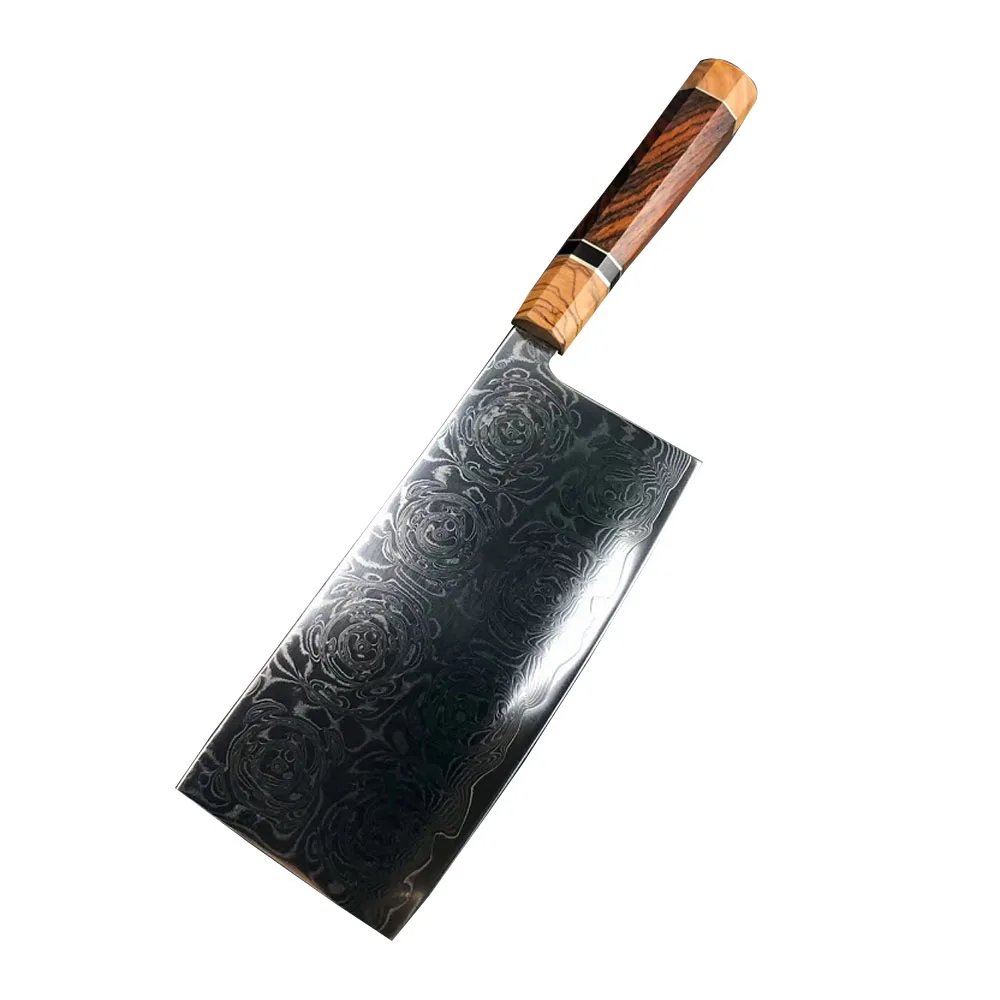 Высота: 33 см Длина лезвия: 19,5 см Длина ручки: 13,5 см Толщина лезвия: 2,2 мм Ширина лезвия: 8,6 см Сталь: импортная Дамасская сталь VG10 (крупная Роза) Твердость: 59-60 HRC Материал ручки: оливковое дерево + черная перегородка + импортные твердые частицы палисандра