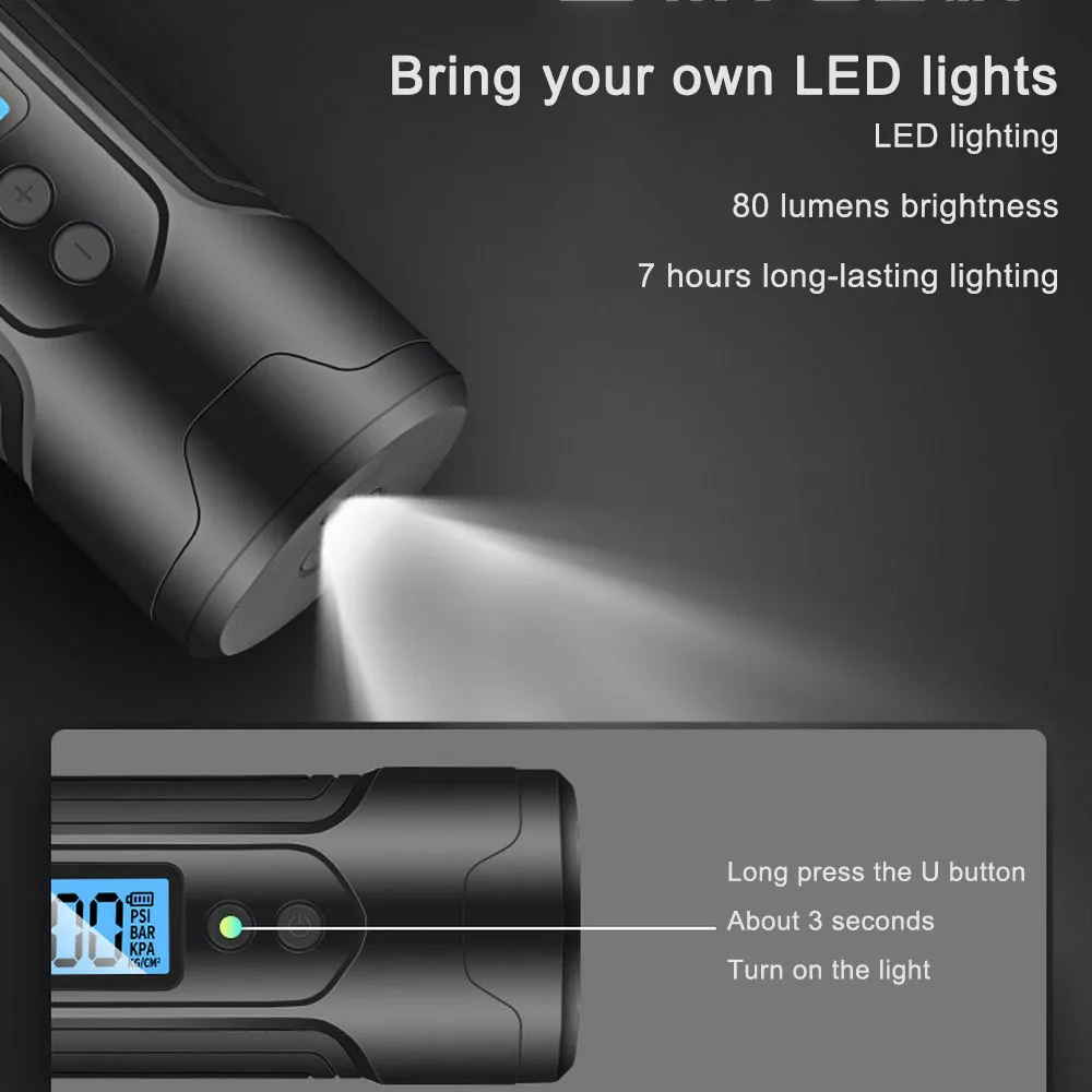 Измерение давления в шинах: Подключите шланг к сердечнику нижней шины. Нажмите кнопку питания, чтобы включить ЖК-экран, и он отобразит текущее давление в шинах. Съемное зарядное устройство для телефона, позволяет заряжать сотовый телефон в то же время, вес нетто батареи 128,6 г/фунтов, мини-размер может идеально положить в карман. Комплексное Хранение: игрушечная насадка, Шариковая игла и Presta были храниться в задней части насоса. Аккумулятор большой емкости: Этот портативный компрессор сертифицирован литий-ионным аккумулятором и портом USB для зарядки, который поддерживает быструю зарядку. Вы можете наслаждаться эффективной зарядкой, большой аккумулятор емкостью 3000 мАч (1000 мАч * 3). Быстрая автонадувание: в шинах имеется 4 переключаемых блока давления (PSI, BAR, KPA, кг/см), так что вы можете задать давление в шинах по вашему желанию. Насос для шин будет автоматически отключаться при достижении заданного давления в шинах. Инфлятор имеет максимальное Надувное давление 150psi. Многофункциональный: с беспроводным портативным дизайном насос позволяет достигать всех шин ваших велосипедов, мотоциклов, автомобилей (включая внедорожники). Также оснащена 3 насадками-адаптерами для матрасов/надувных лодок/игрушек/спортивных мячей/надувных изделий. Беспроводная портативная конструкция: беспроводной дизайн и компактный мини-размер этого шинного насоса делают его портативным и простым в управлении одной рукой. Вам нужно всего 4 действия, чтобы начать надувание. ЖК-экран показывает давление в реальном времени сбоку, так что вы можете отслеживать давление, не гнув, чтобы увидеть дно. Ночной Применение: подсветка COB светодиодные фонари позволяет удобно Применение цифровой Надувное как шины манометр и Надувное в темное время суток.