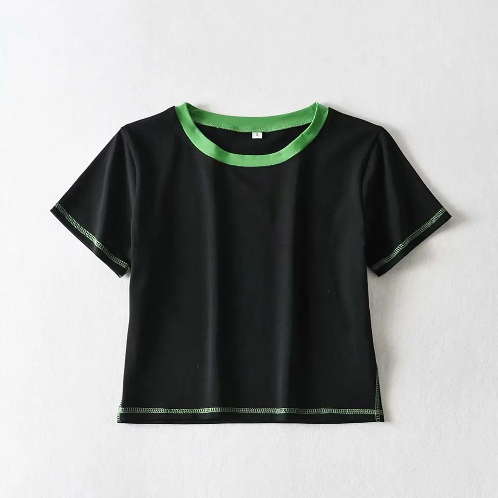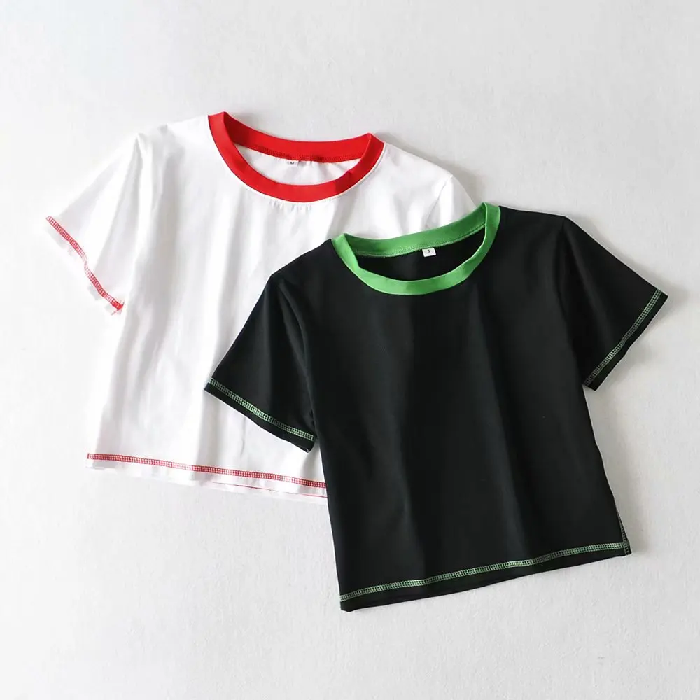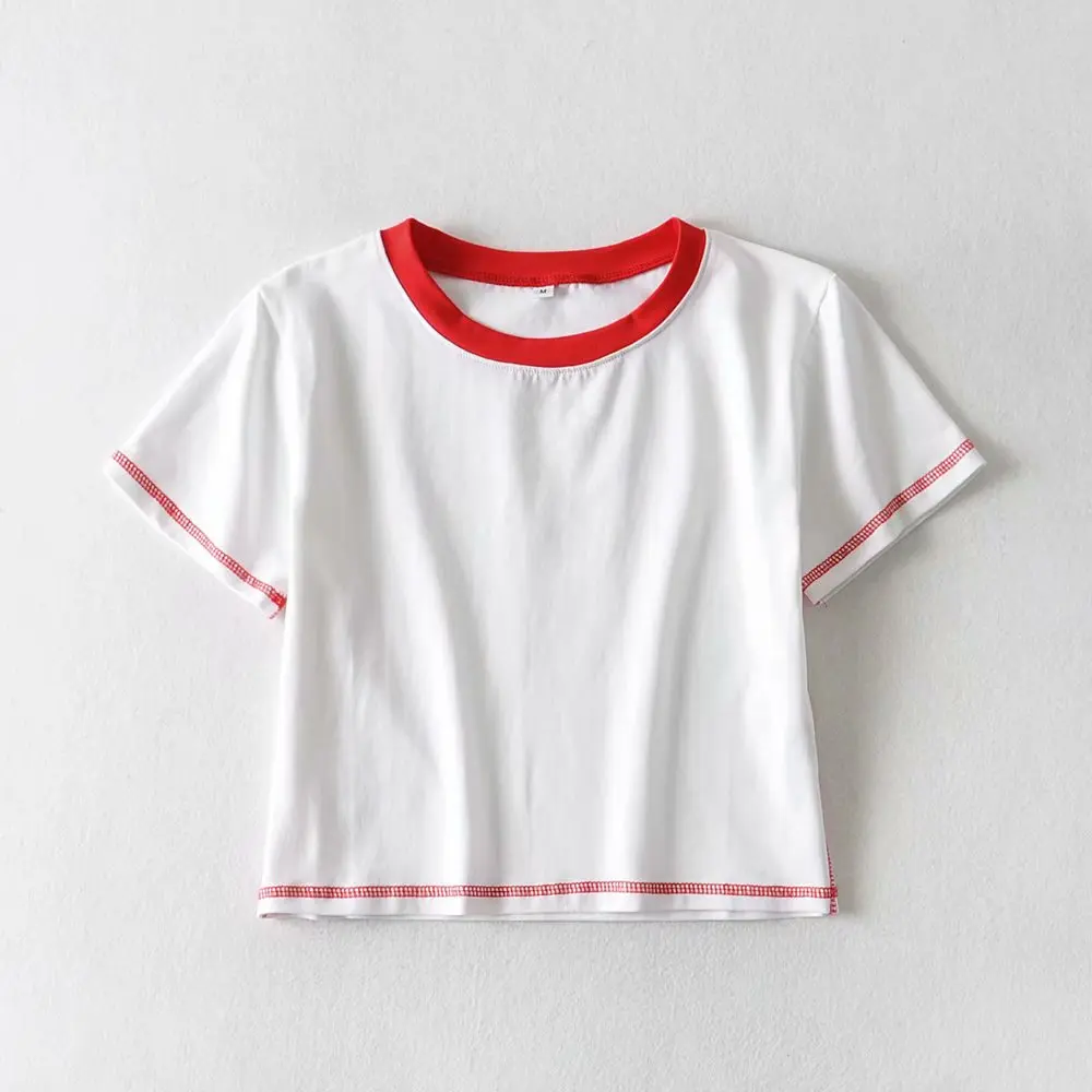 Мягкая белая хлопковая Футболка с круглым вырезом, красным воротником и вышивкой.