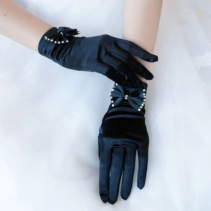 Длина запястья, полный палец, однотонный черный цвет, большие стразы, украшенные бантом на запястье.