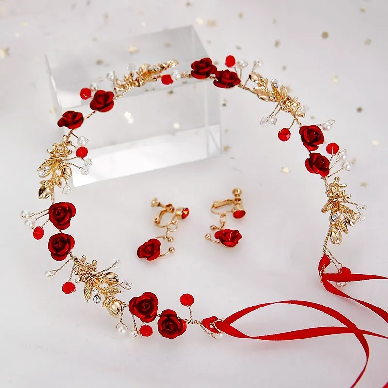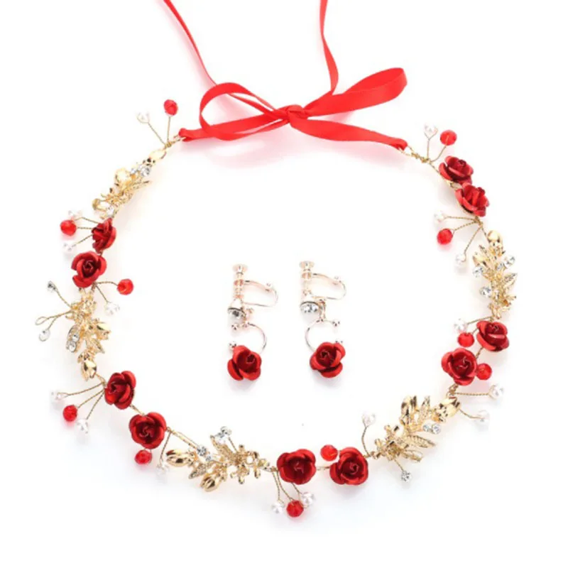 Бренд: niushuya Стиль изделия: Свадебная лента для волос с красной розой Размеры: ссылка на фото Камень: кристалл/Стразы/искусственный жемчуг/аксессуары Покрытие: золото Случаи: Свадебные/вечерние/Выпускной/Юбилей/сценическое шоу/сделанные фотографии Упаковка: полиэтиленовый пакет для упаковки 1 партия посылка, включая 1 шт. hairwear + 1 пара сережек