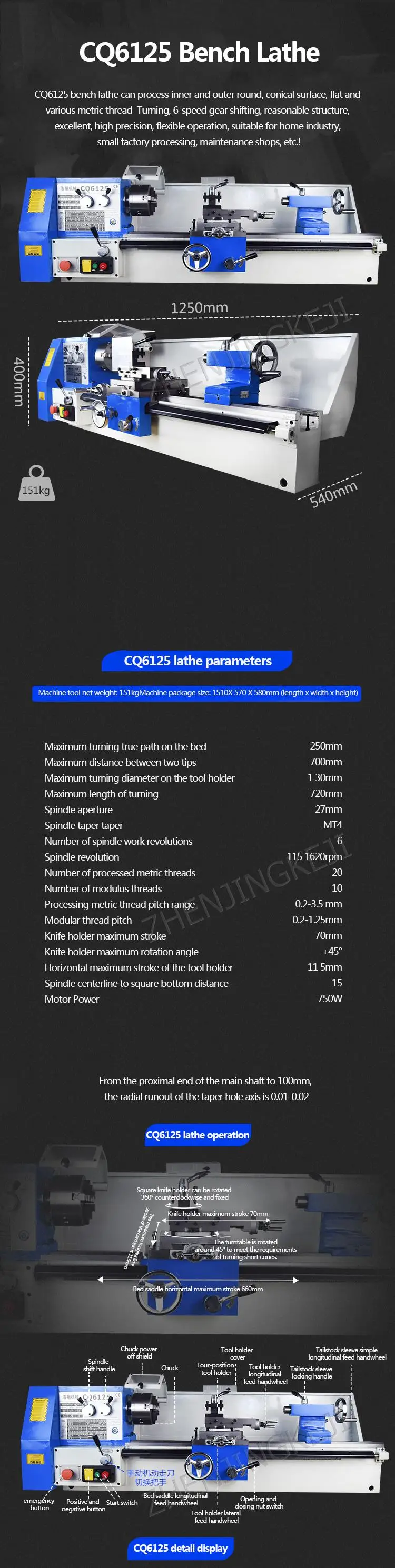 Проксимальный конец главный вал передаточного механизма выполнен до 100 мм, радиального биения коническим отверстием оси составляет 0,01 ~ 0,02 мм Максимальный диаметр обработки кровати: 250 мм Максимальный диаметр обработки заготовки при перевозке: 1 30 мм Расстояние между двумя центрами: 700 мм Диаметр патрона: 125 мм Диафрагма шпинделя: 26 мм Шпинделя с коническим отверстием производства: MT4. Скорость вращения шпинделя: 6 Диапазон скоростей шпинделя: 115-1620 R.P.M Обрабатывающие метрические типы резьбы: 20 / 0. 2-3,5 мм Обрабатывающие дюймовые типы резьбы: 20 / 8-56T. P.I Ход прицепа: 115 мм Инструмент пост-такт: 70 мм Максимальный угол вращения стойки инструмента: 45 градусов Задняя крышка рукава ход: 70 мм Конус рукава: MT2 Параметры двигателя: 750 Вт-220 В/380 В Размер упаковки: 1510*570*580 мм Вес брутто/Вес нетто: 180 / 165 кг