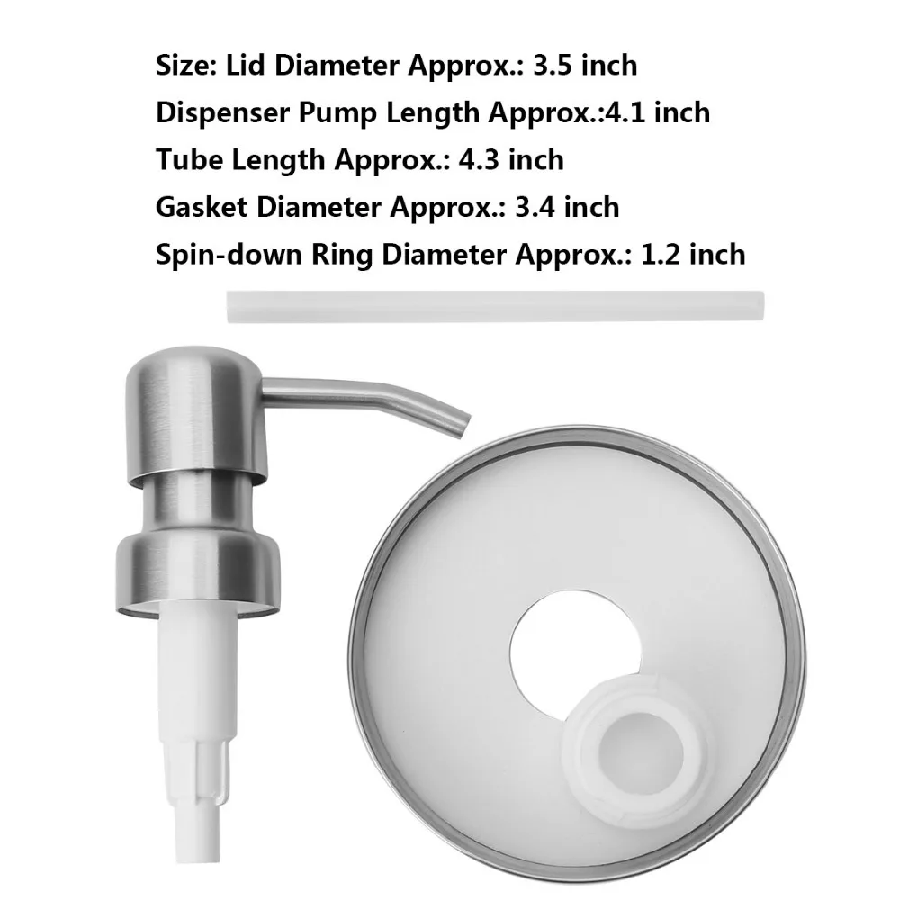 Набор включает в себя: один стеклянная банка с завинчивающейся крышкой крышка + один слой подкладки из диспенсер мыла насос + один слой подкладки из трубки 4 дюймов + один силиконовая прокладка + один спин-переходное кольцо.