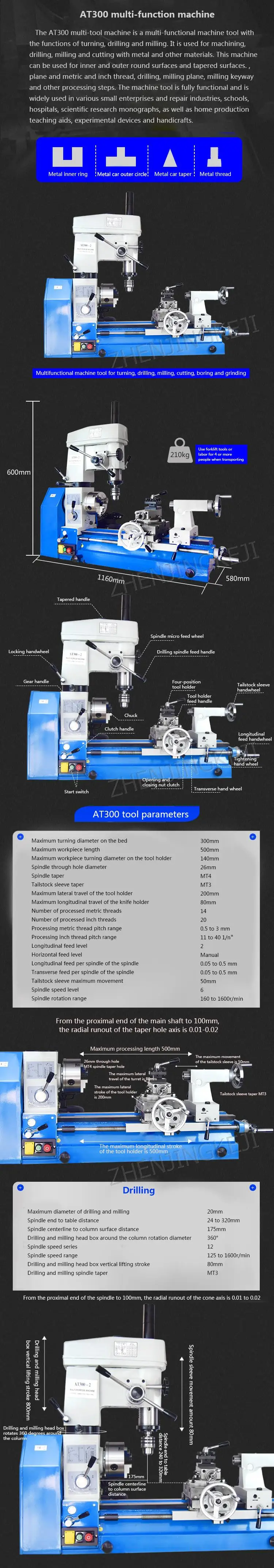 Многоинструментальный станок AT300-это многофункциональная инструментальная машина с функциями поворота, сверления и фрезерования. Подходит для обработки, сверления, фрезерования и резки металла и других материалов. Эта машина может быть использована для поворота внутренних и внешних поверхностей., плоских и метрических и дюймовых нитей, сверления, фрезерной плоскости, фрезерного ключа и других этапов обработки. Машинный инструмент полностью функциональен, и он широко используется в различных малых предприятиях и ремонтных отраслях, школах, больницах, научно-исследовательских единицах и даже семьях для производства учебно-методических средств, экспериментальных устройств и изделий ручной работы.