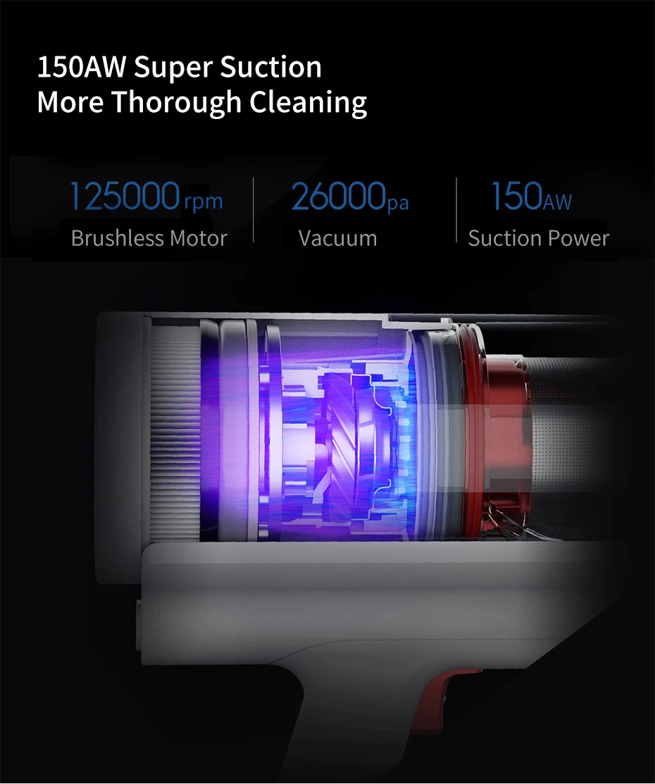 ● 125000 об/мин, бесщеточный двигатель, 26000 ПА вакуум, 150AW мощность всасывания