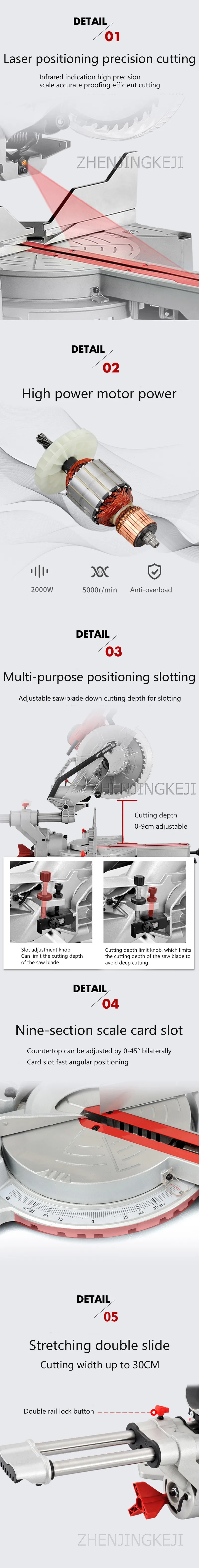 Product model: JIG ZP28-255(Single oblique section) Slope adjustment: single slope Rated voltage: 220V Rated power: 2000W No-load speed: 5000r / min Positioning method: laser positioning Saw blade specifications: 255*, 25.4mm Package size: 90*55 * 43cm Gross weight / net weight: 19.5kg / 16kg Product model: JIG-ZP29-2559(Double oblique section) Slope adjustment: double slope Rated voltage: 220V Rated power: 2000W No-load speed: 5000r / min Positioning method: laser positioning Saw blade specifications: φ250* 25.4mm Package size: 90*55*37cm Gross weight / net weight: 20.5kg / 17kg Power type: AC power Saw blade size / diameter: 255 (mm) Cutting depth -45 °: 40mm Cutting depth -90 °: 90mm Scope of application: cutting wood, aluminum, PC materials Standard accessories: Saw blade wrench Dust bag Laser positioning Rated voltage range: AC single phase and DC 50V and below