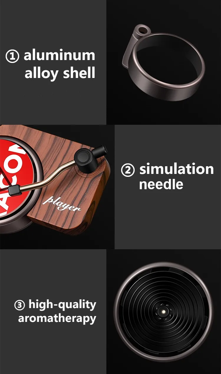 Подходит для: ① сменный запись Ароматерапия ② Вращающаяся ветровая пластина (лоток для ароматерапии) ③ Стилус поворотного проигрывателя ④ Декоративная коробка для пения под дерево ⑤ Из алюминиевого сплава имитация ⑥ Металлический винт ⑦ Световой индикатор основной корпус воздуховода ⑧ Металлический зажим ⑨ Силиконовый куртка